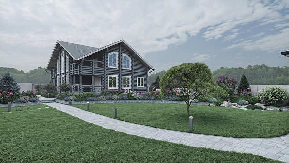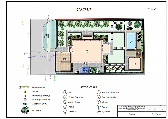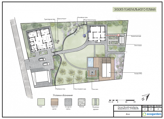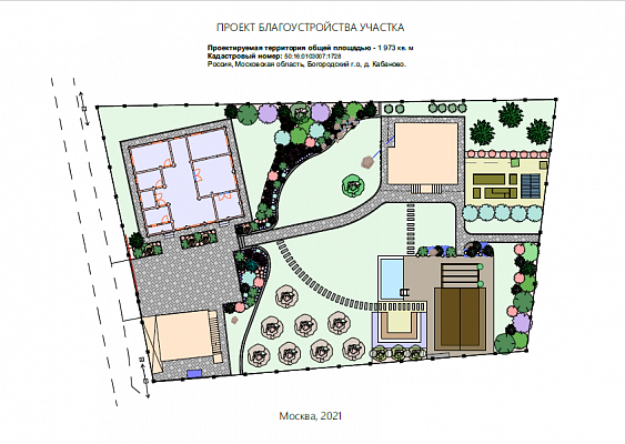 Ландшафтный проект участка общей площадью 12 соток в деревне Юсупово г.о. Домодедово: генплан, эскиз, фоторендеры, топографическая съемка, дендроплан, план освещения, спецификации, ведомости.