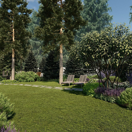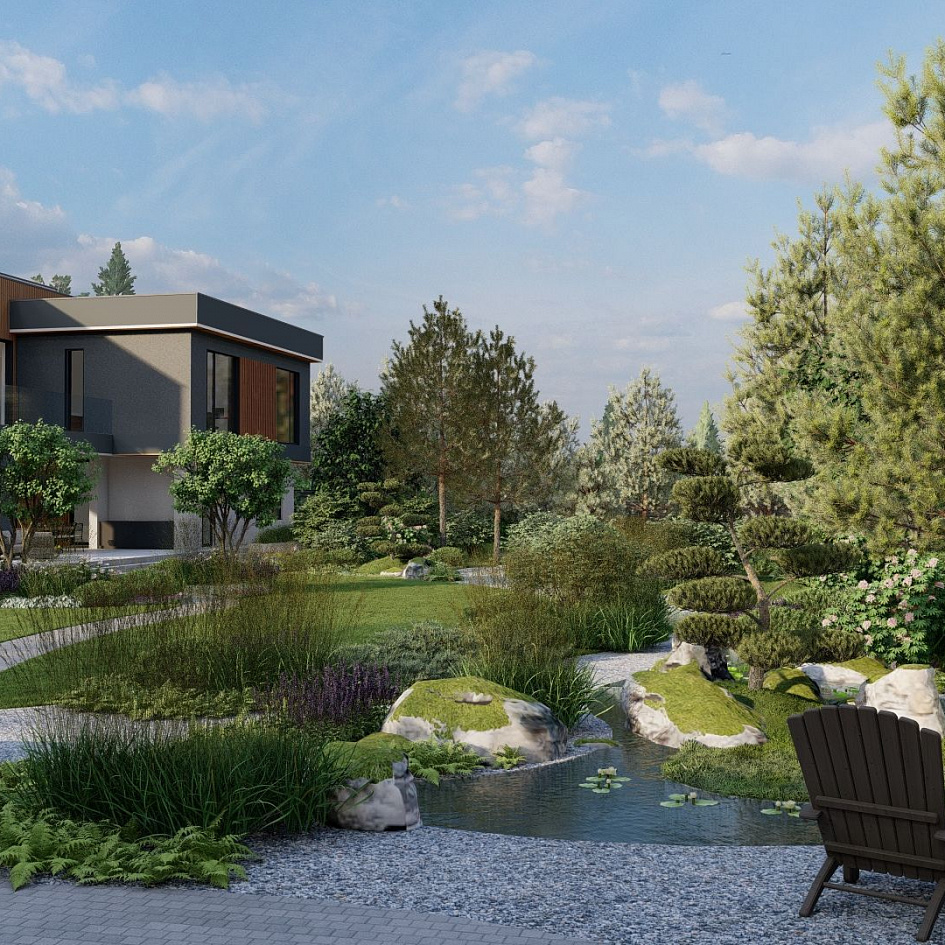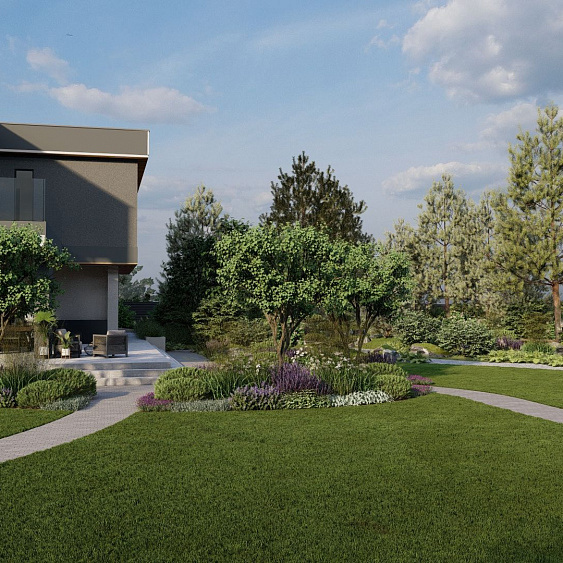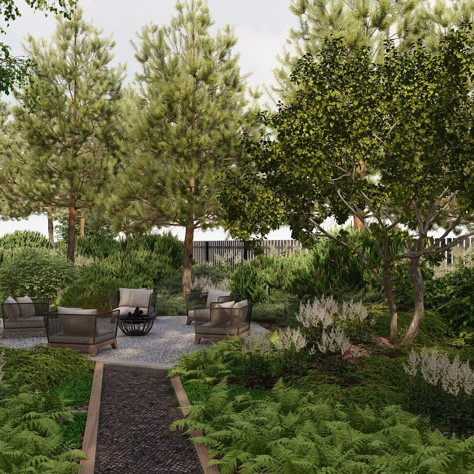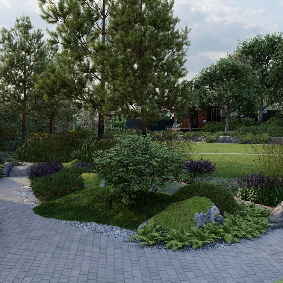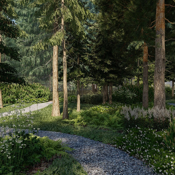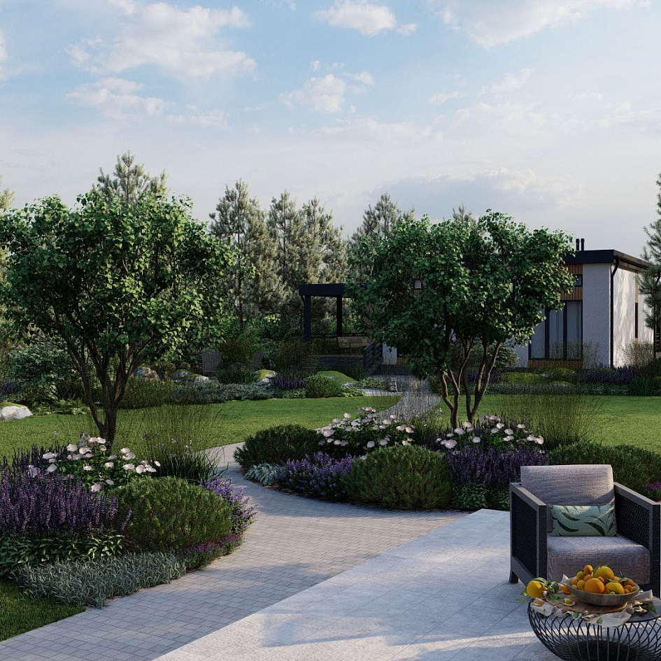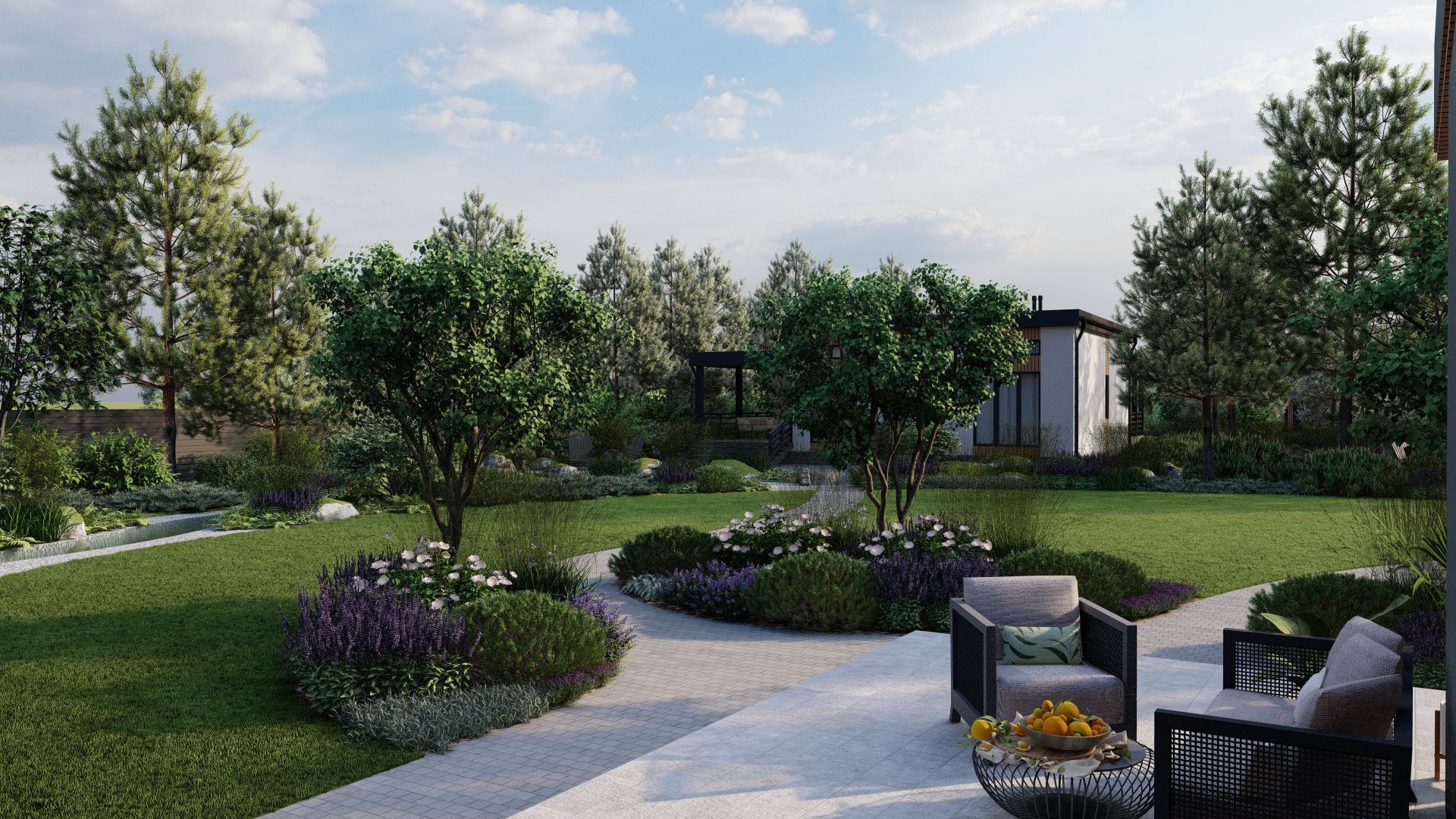 Ландшафтный проект участка общей площадью 52 сотки: генплан, эскиз, фоторендеры, 3D проходка, топографическая съемка, дендроплан, план освещения, спецификации, ведомости.