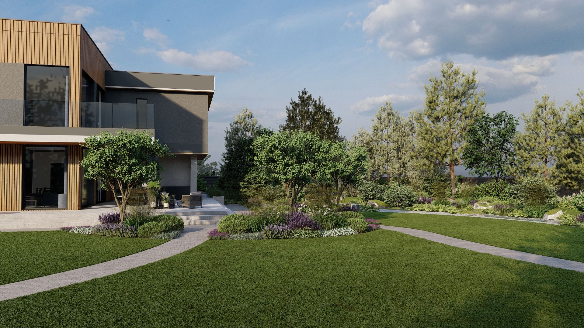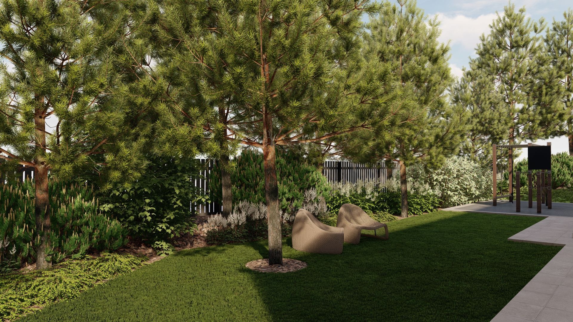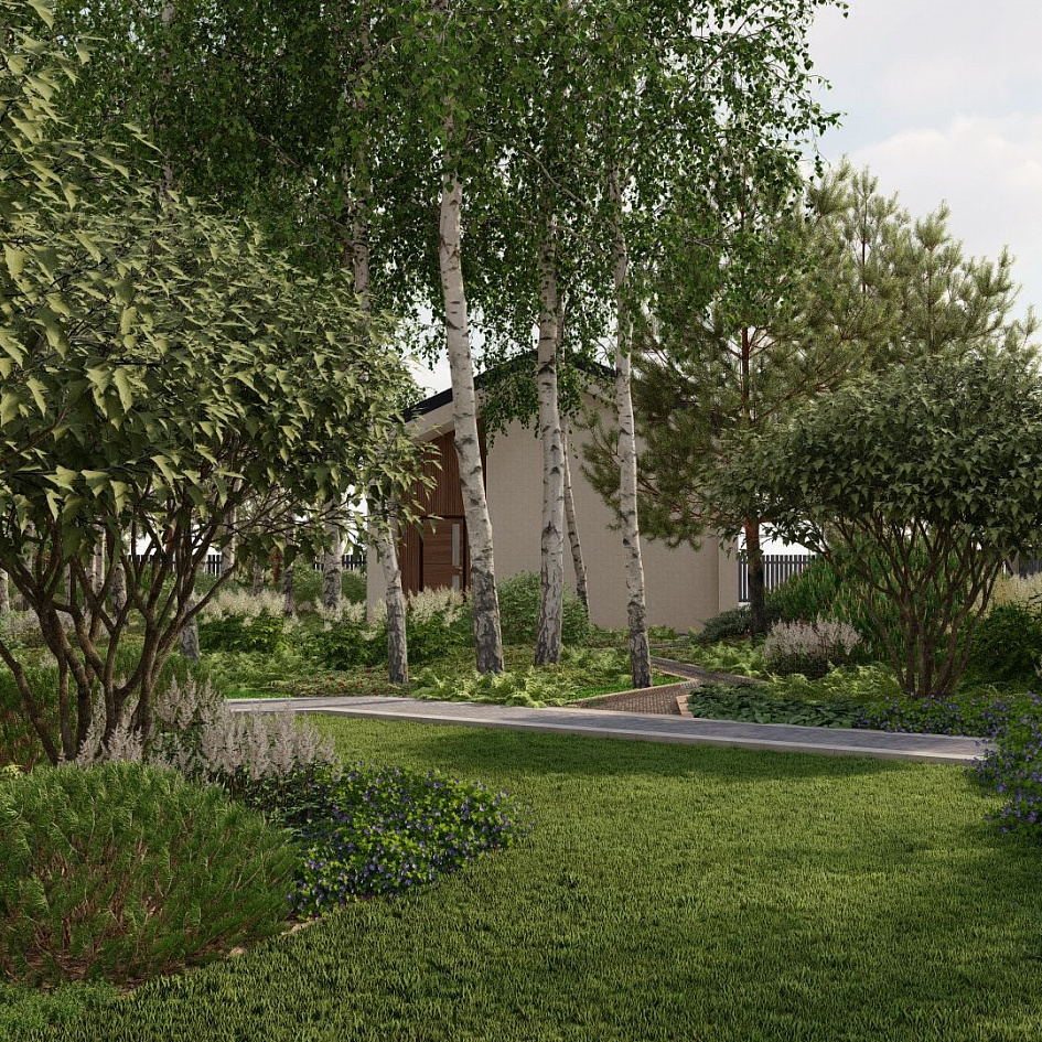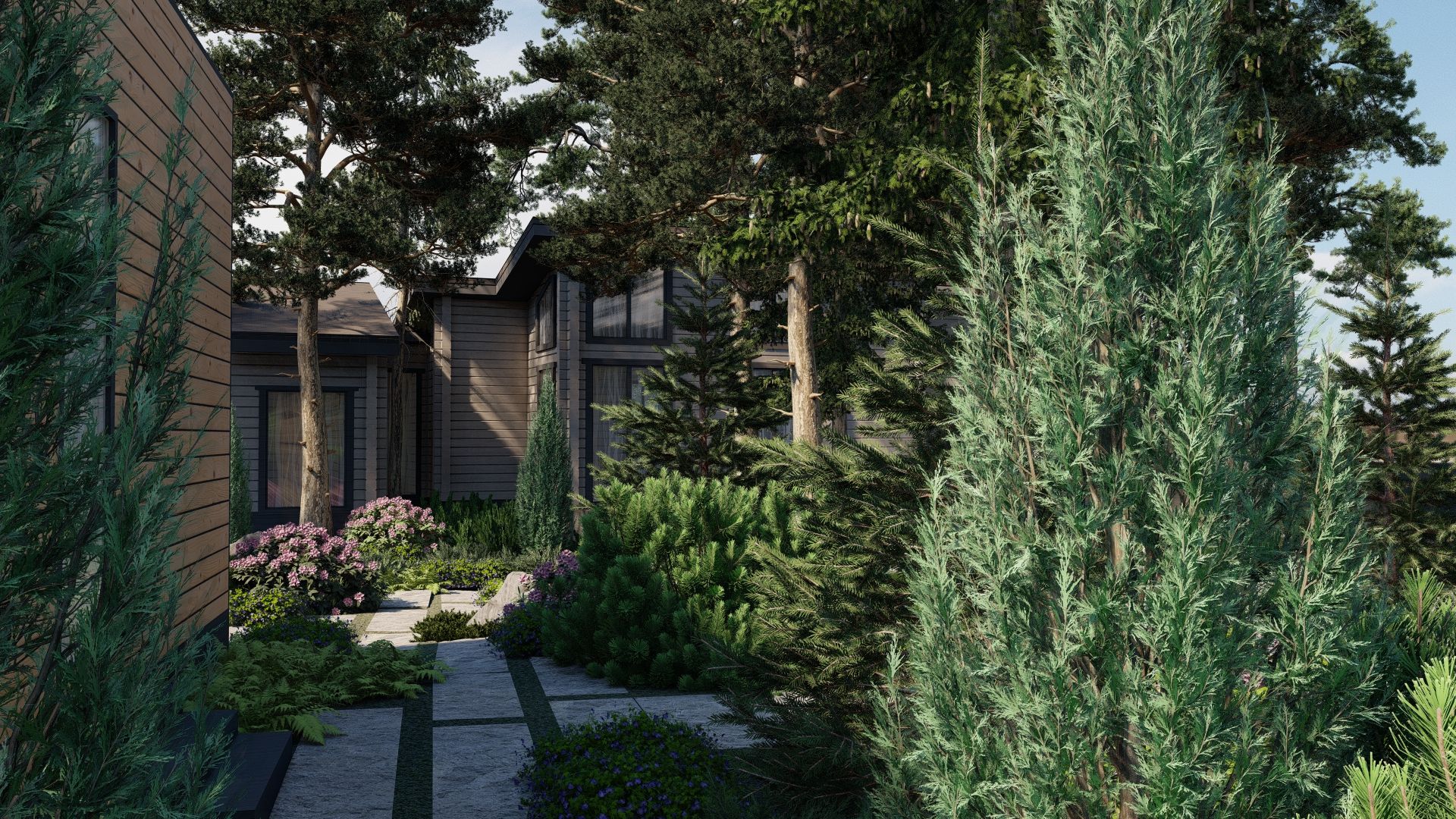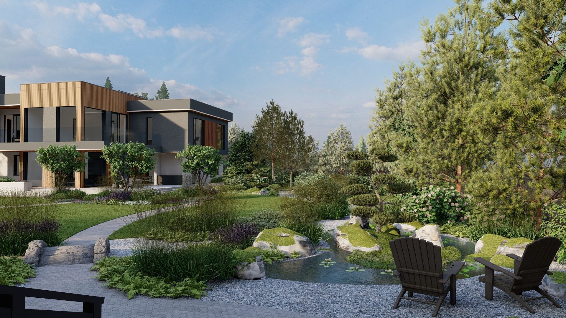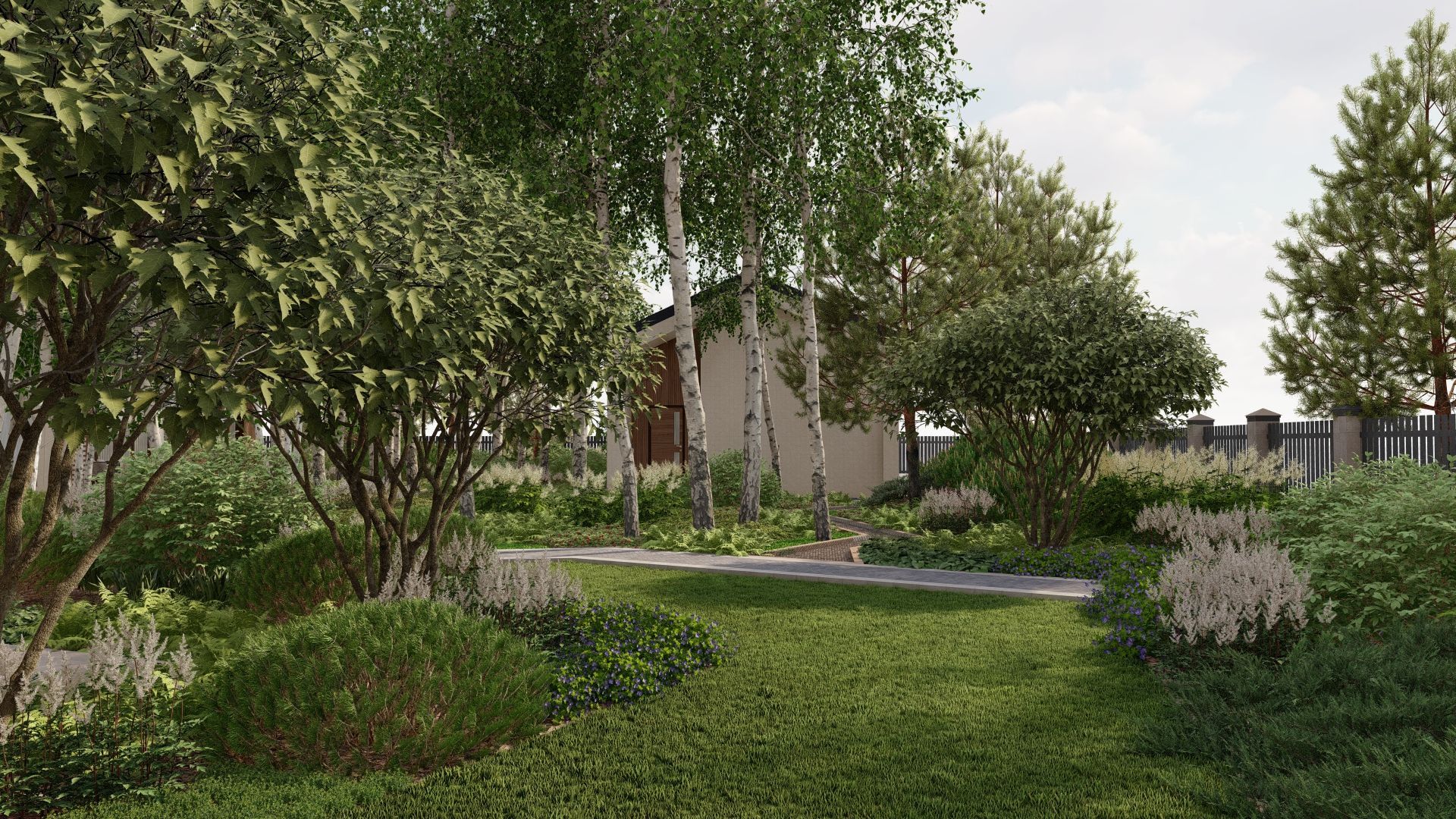 Ландшафтный проект участка общей площадью 52 сотки: генплан, эскиз, фоторендеры, 3D проходка, топографическая съемка, дендроплан, план освещения, спецификации, ведомости.