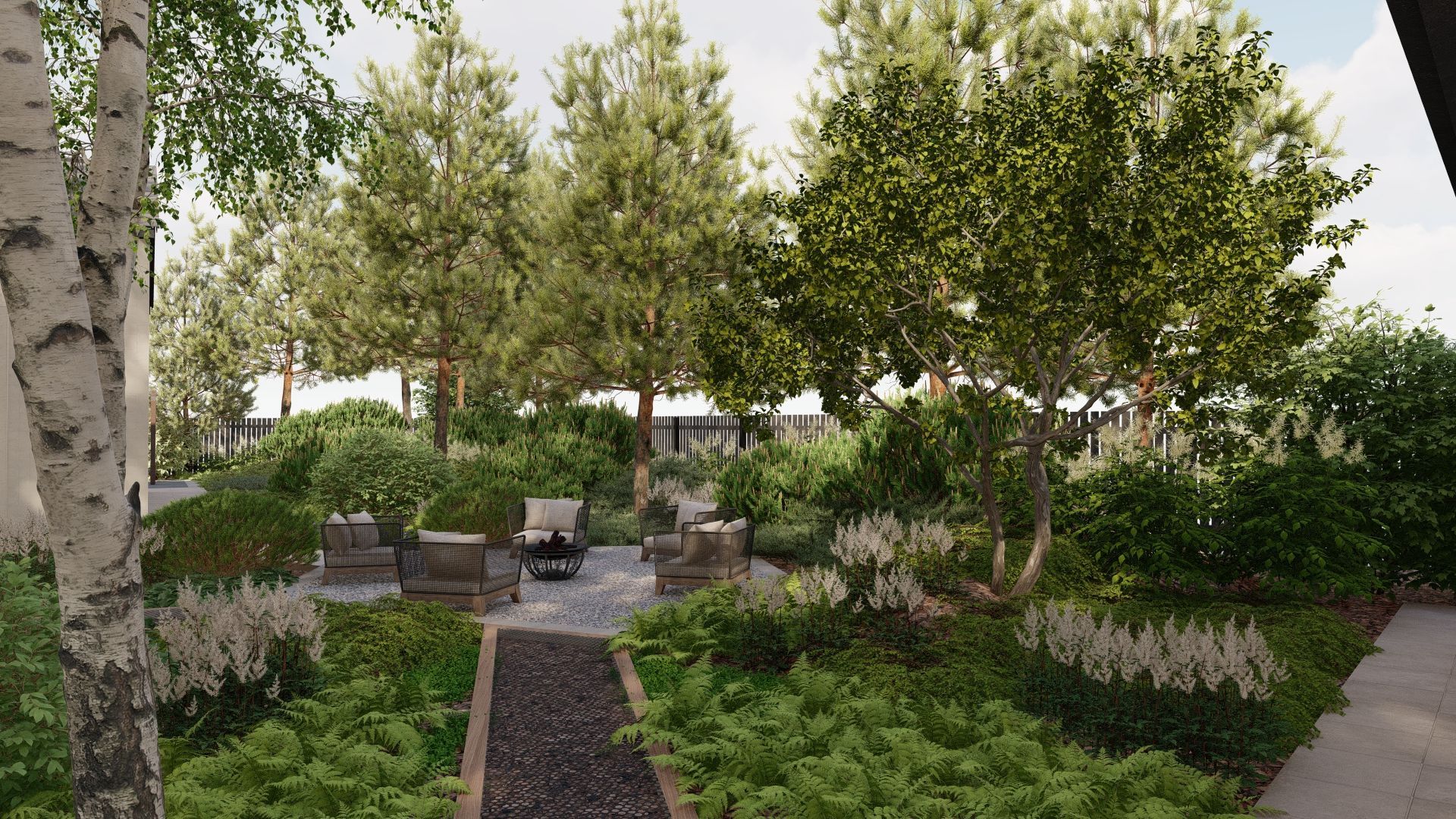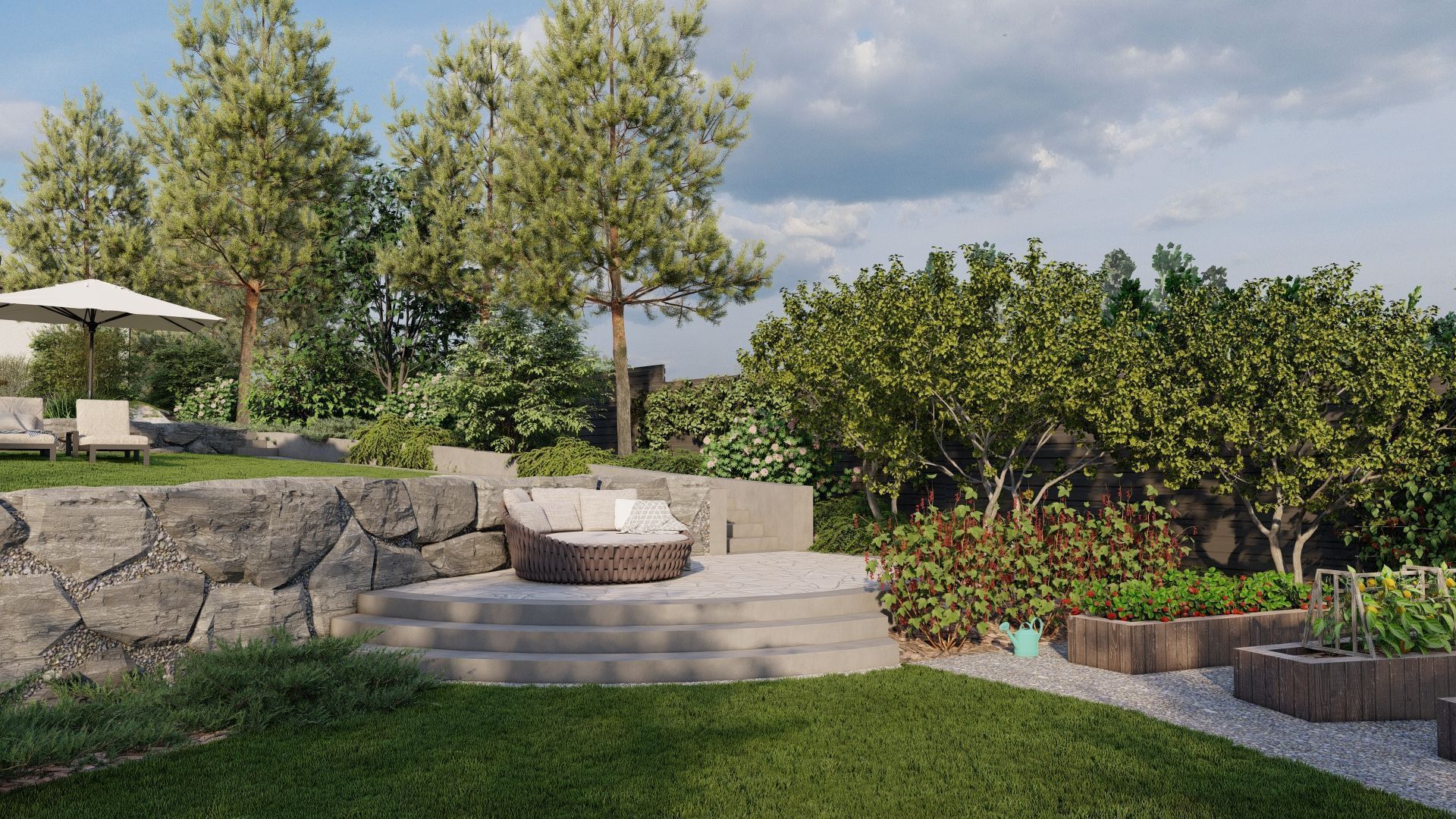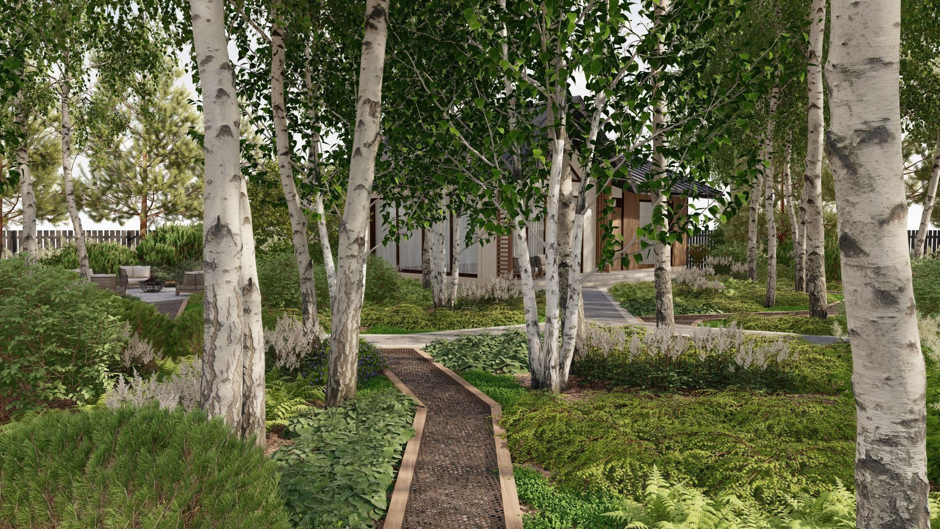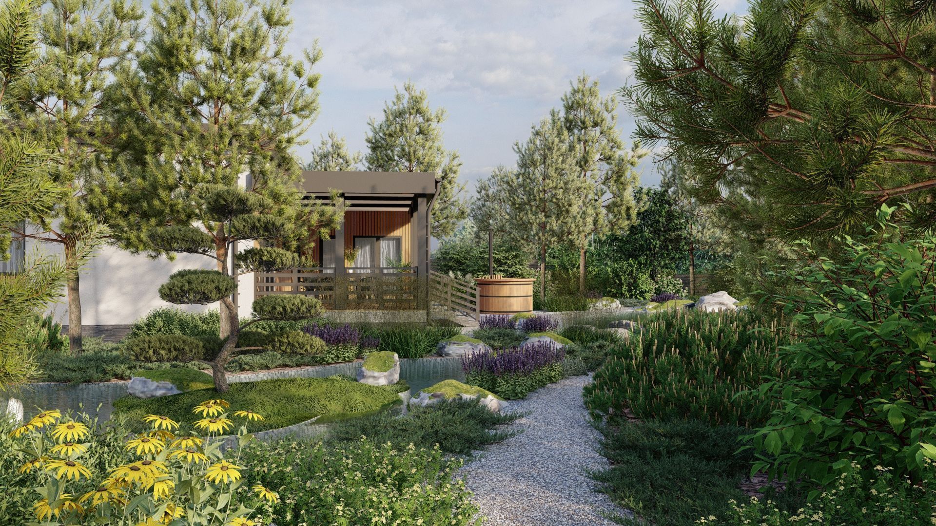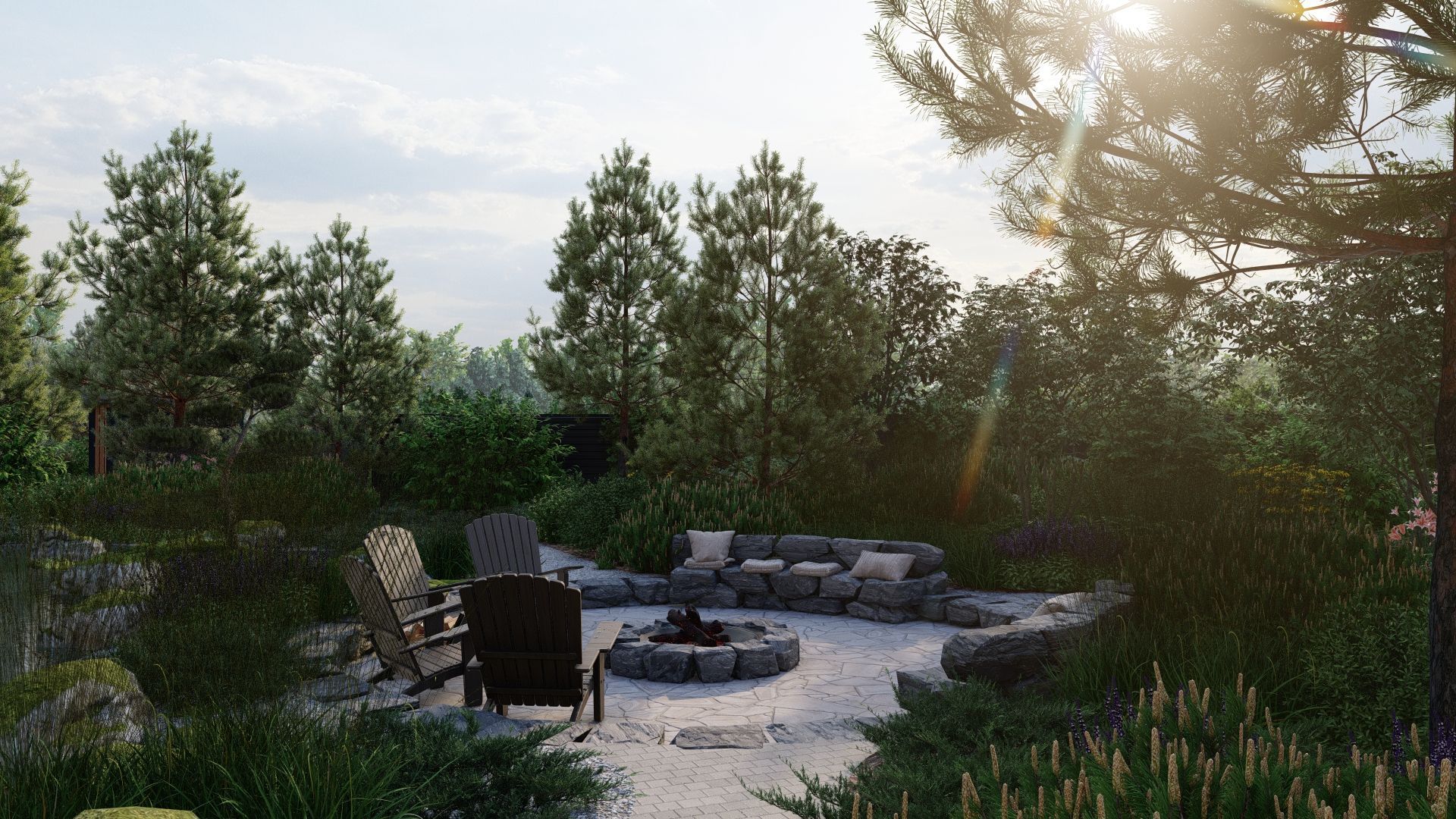 Ландшафтный проект участка общей площадью 52 сотки: генплан, эскиз, фоторендеры, 3D проходка, топографическая съемка, дендроплан, план освещения, спецификации, ведомости.