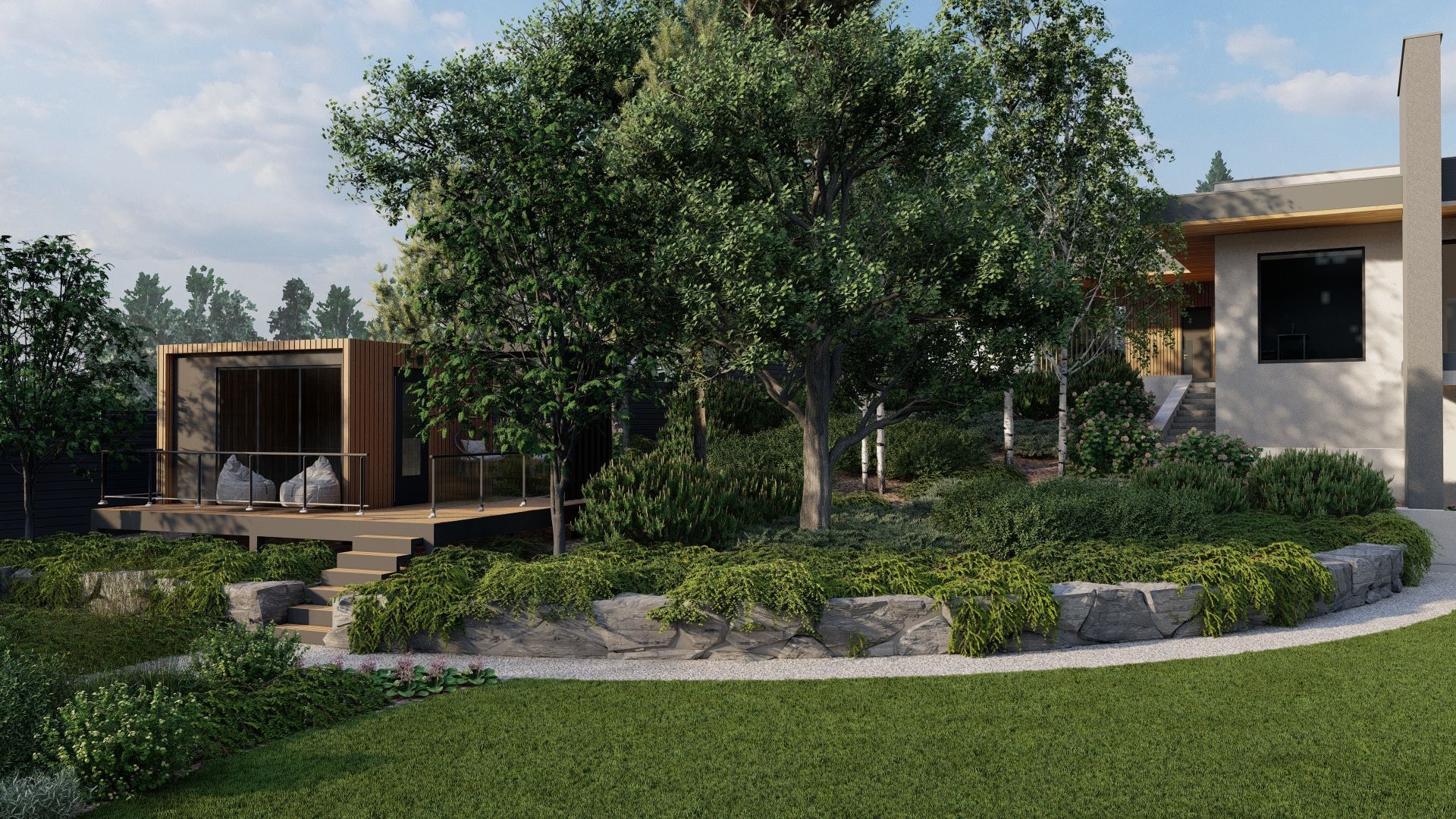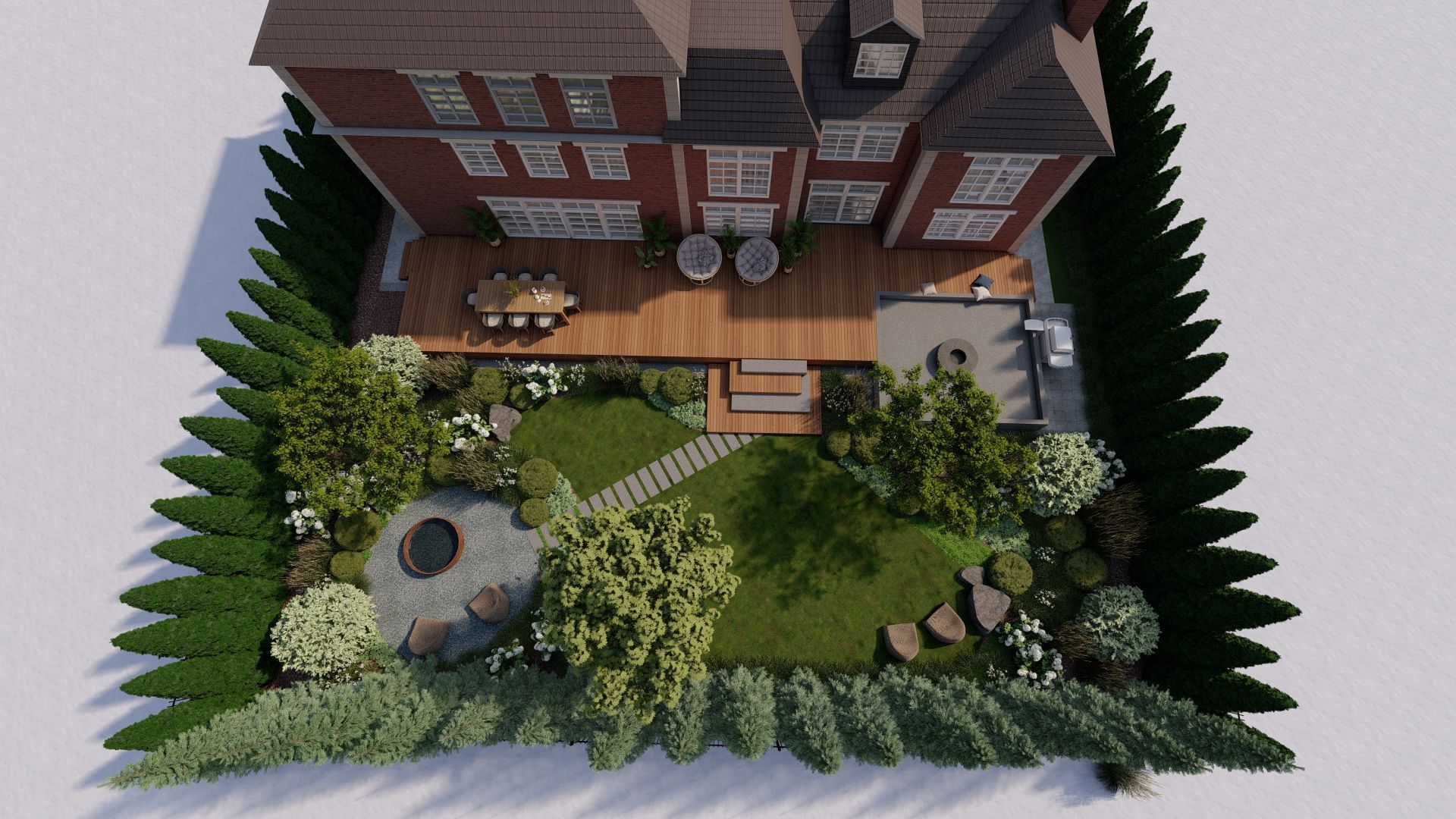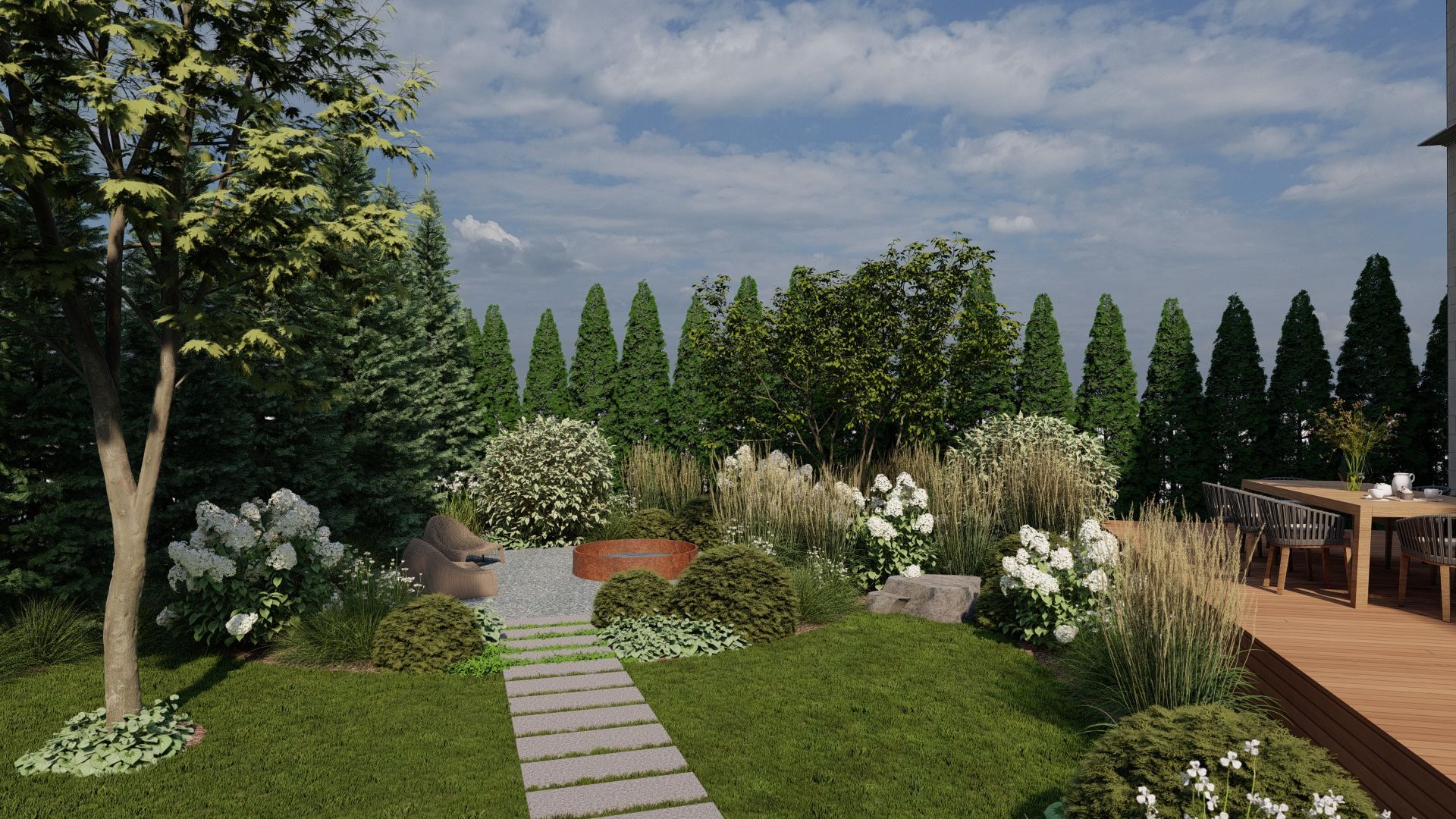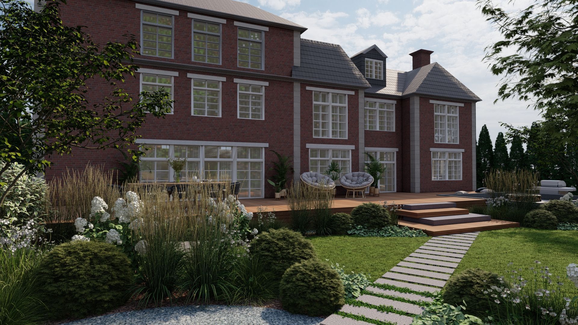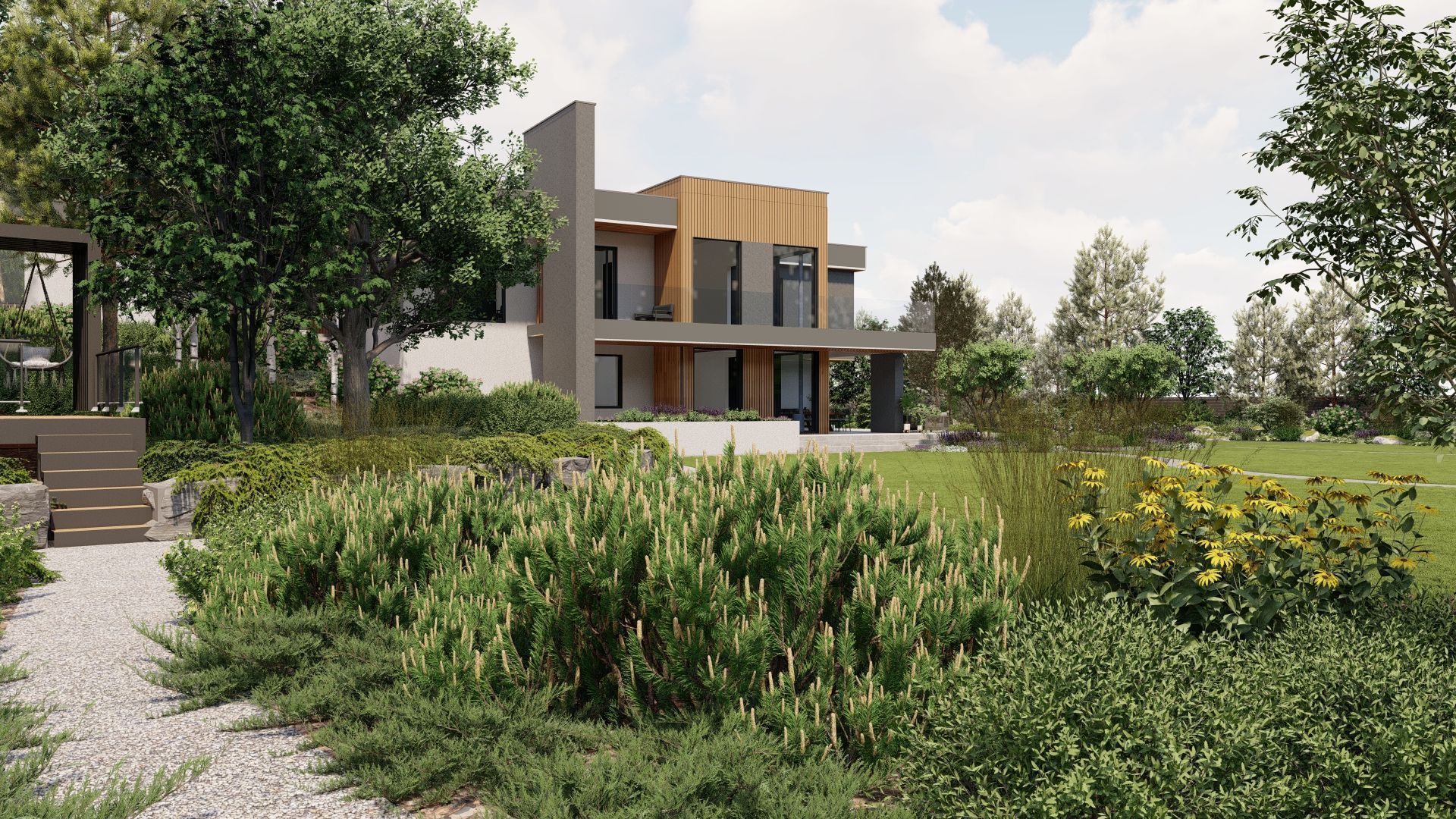Ландшафтный проект участка общей площадью 52 сотки: генплан, эскиз, фоторендеры, 3D проходка, топографическая съемка, дендроплан, план освещения, спецификации, ведомости.