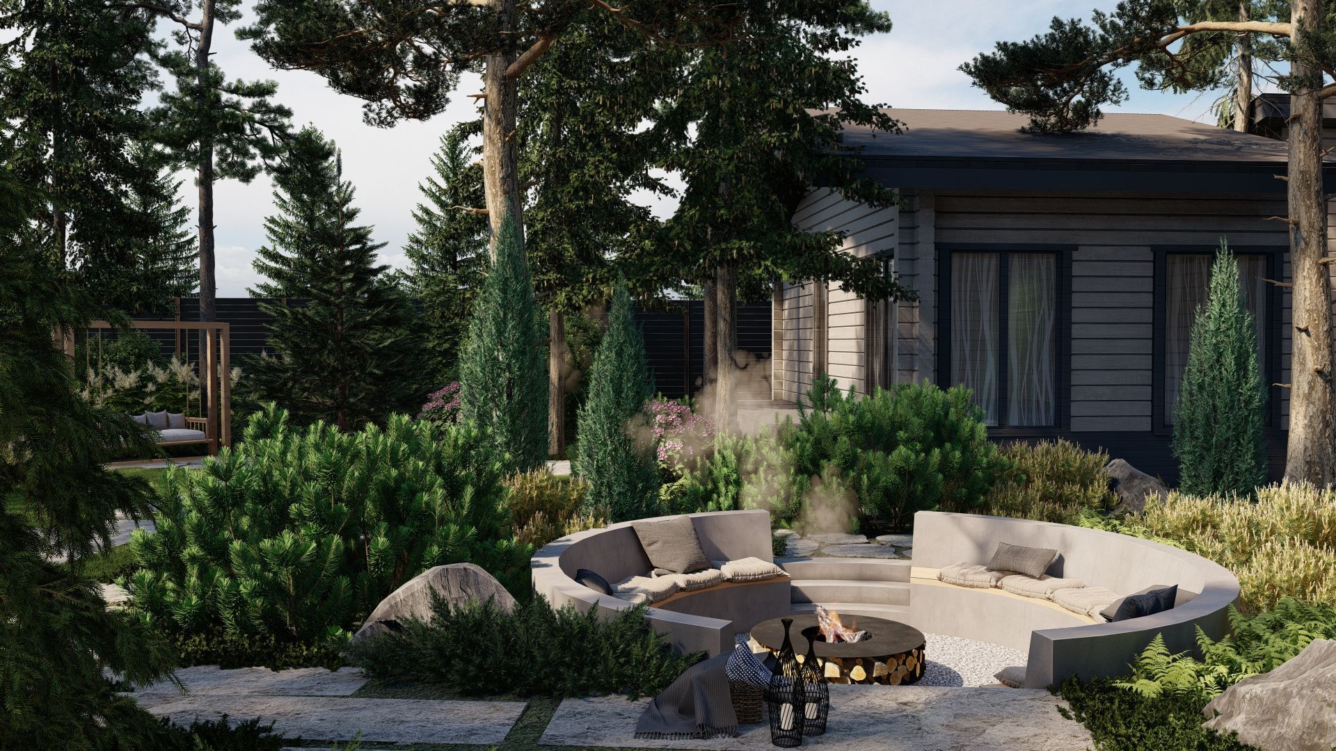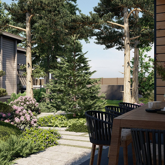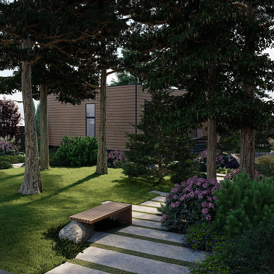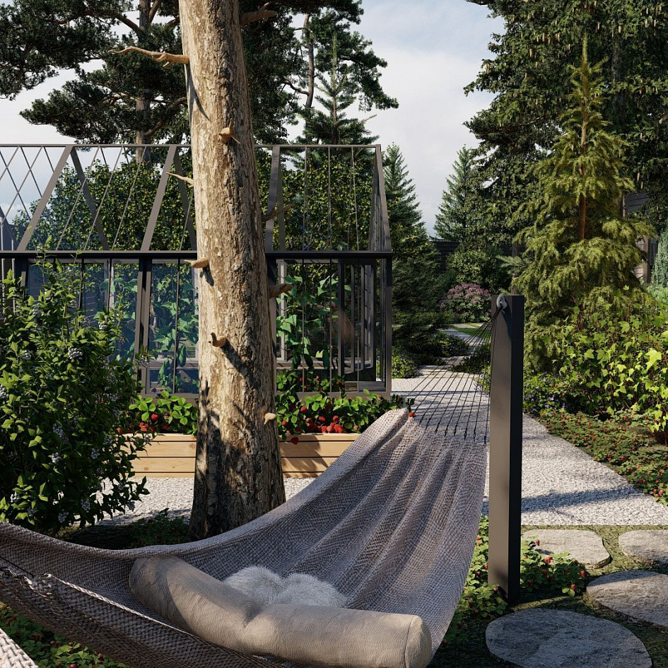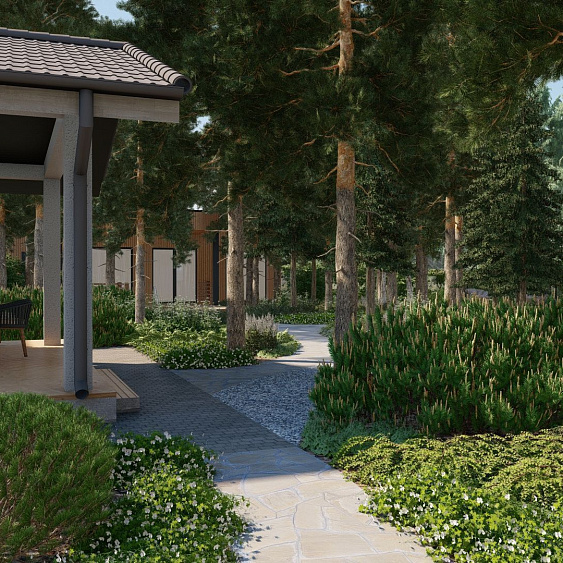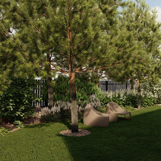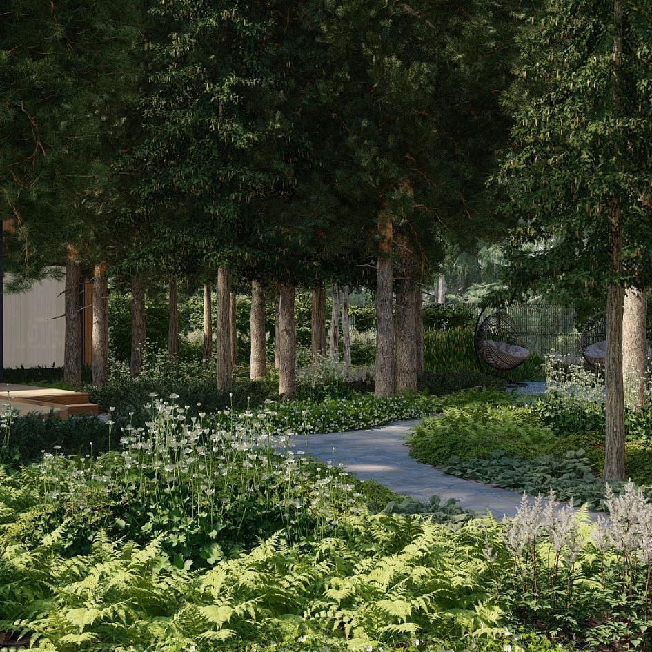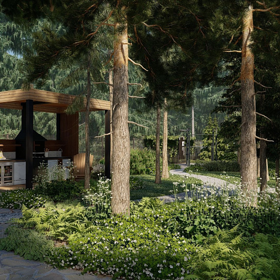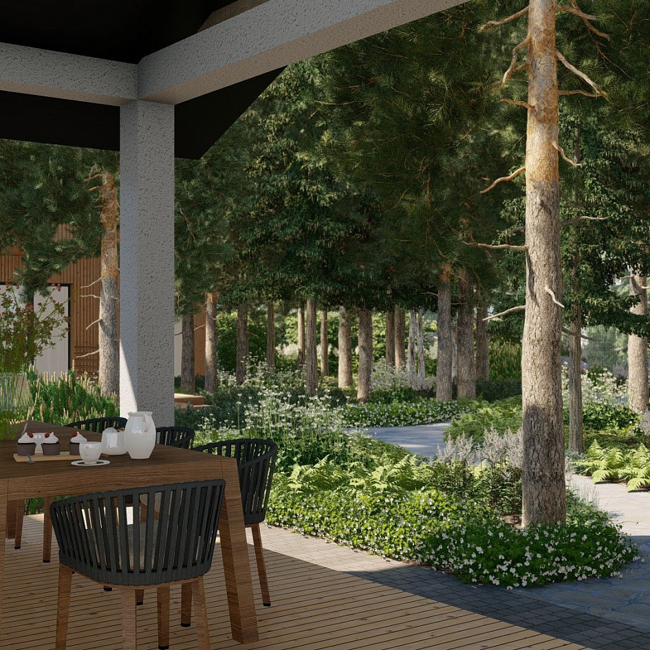 Этот участок изначально был с характером. Вековые сосны и ели, дубы, сложившаяся атмосфера леса — наша главная задача заключалась не в том, чтобы «переделать», а в том, чтобы бережно усилить то, что уже создано природой.