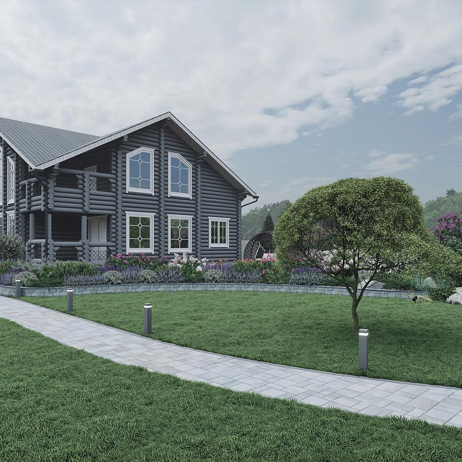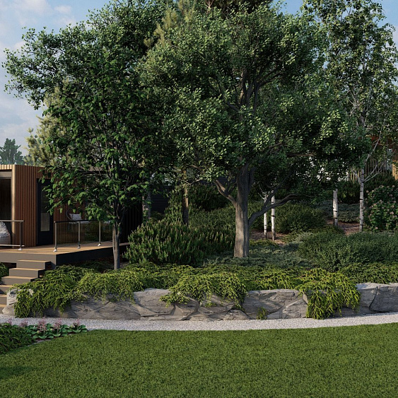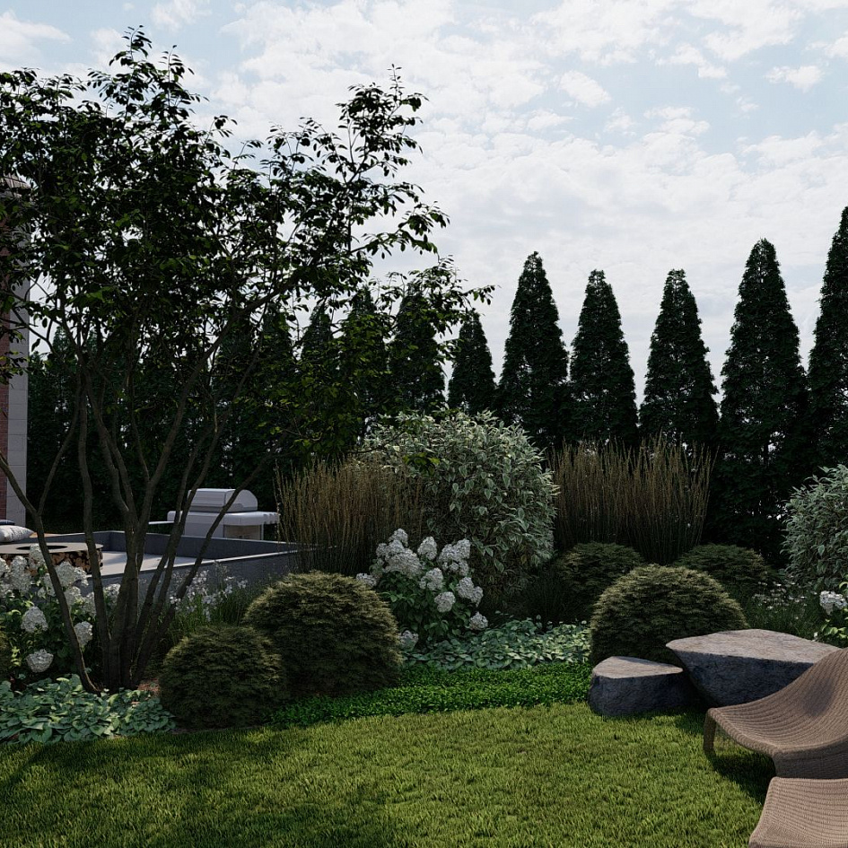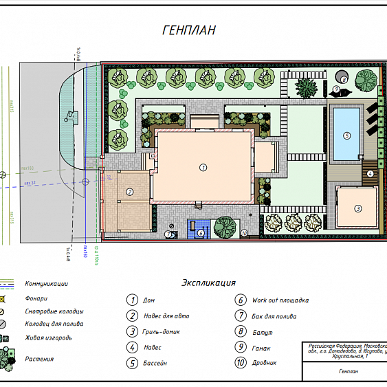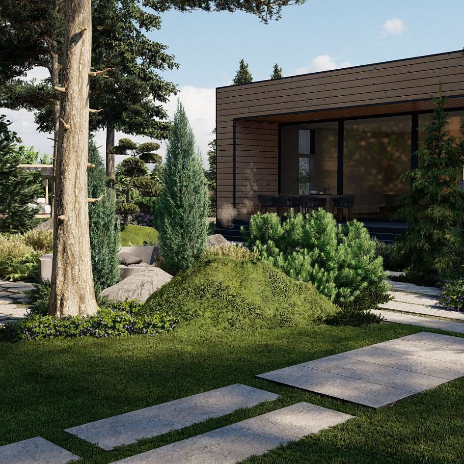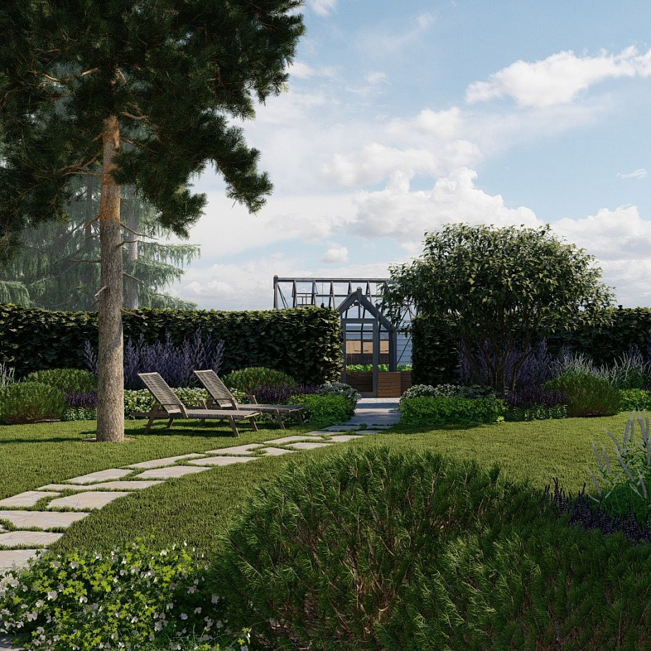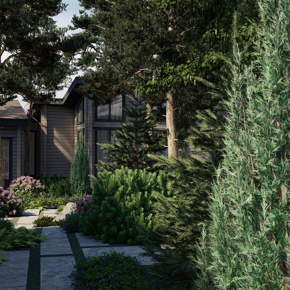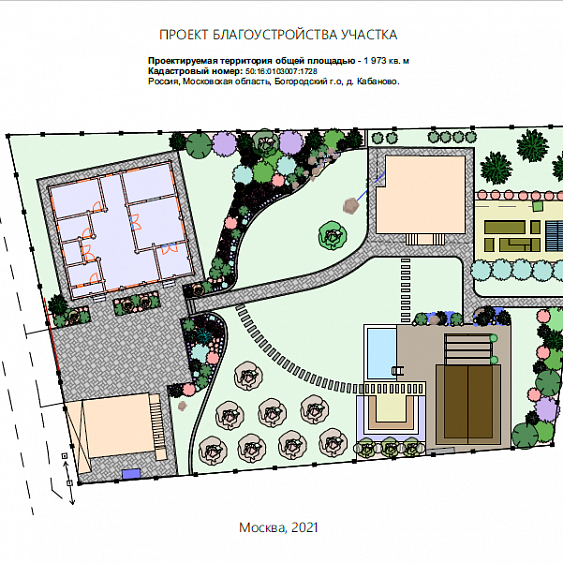 Ландшафтный проект участка общей площадью 18 соток: генплан, эскиз, фоторендеры, топографическая съемка, дендроплан, план освещения, спецификации, ведомости.