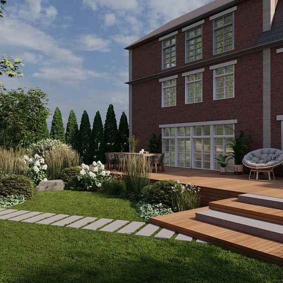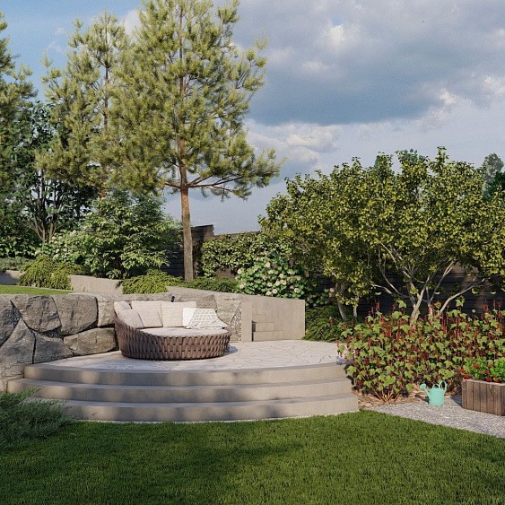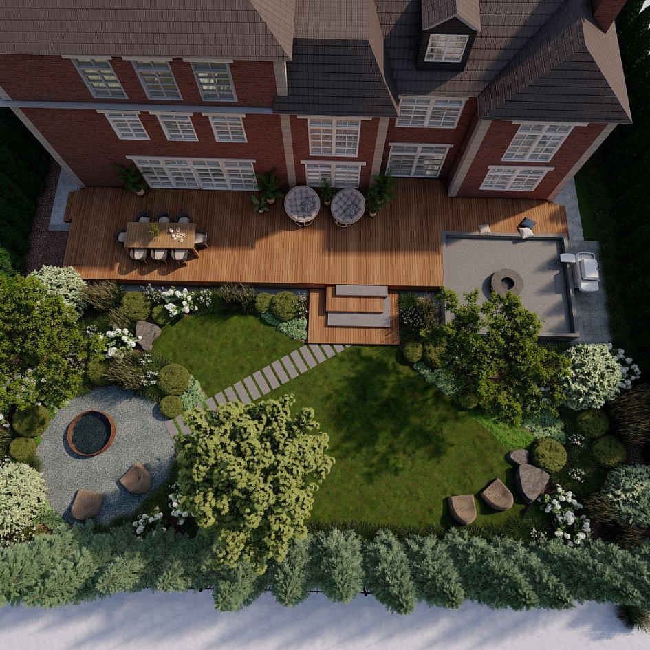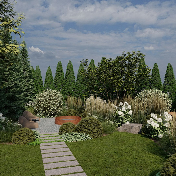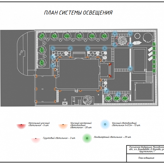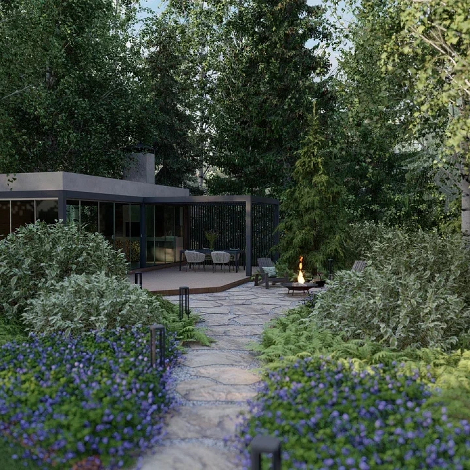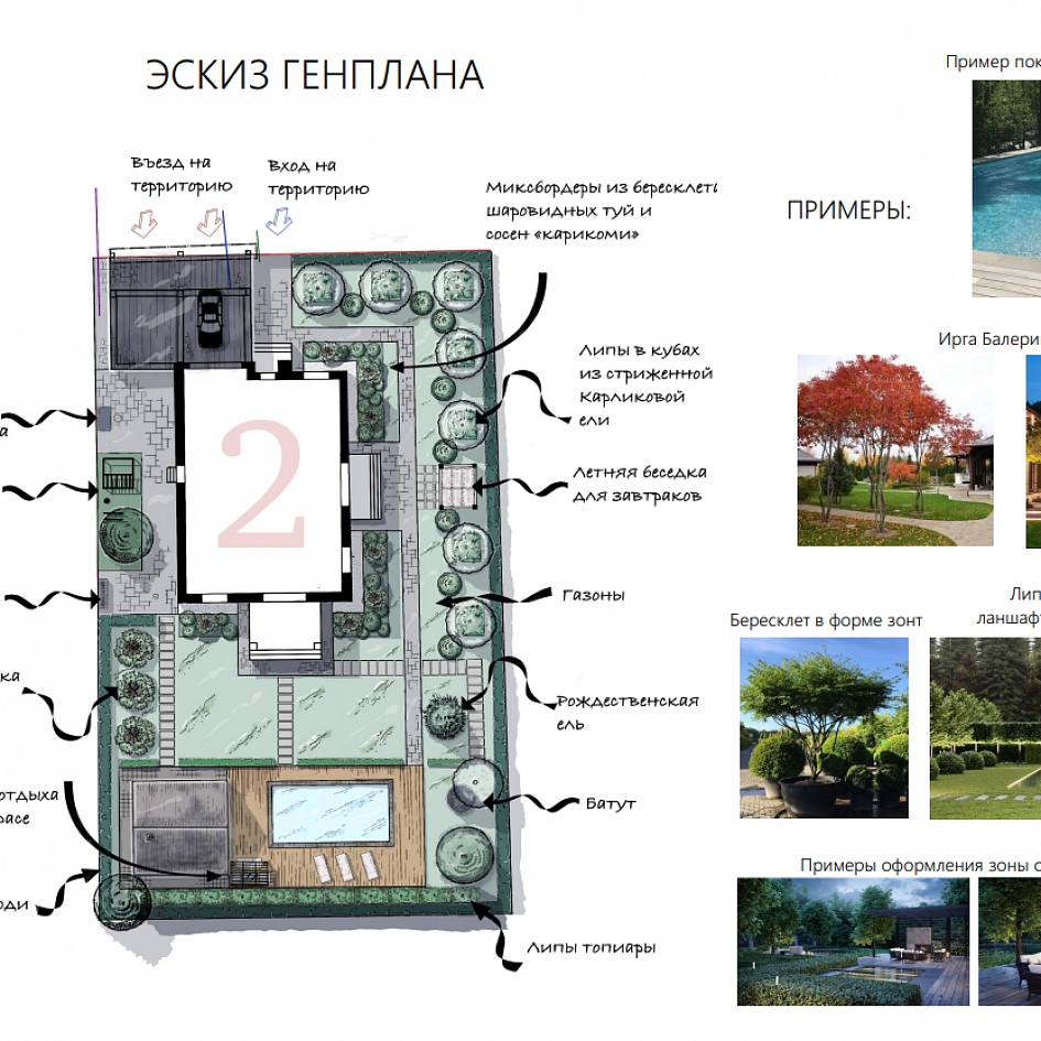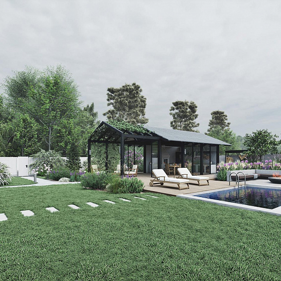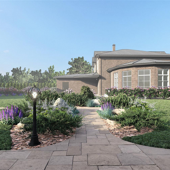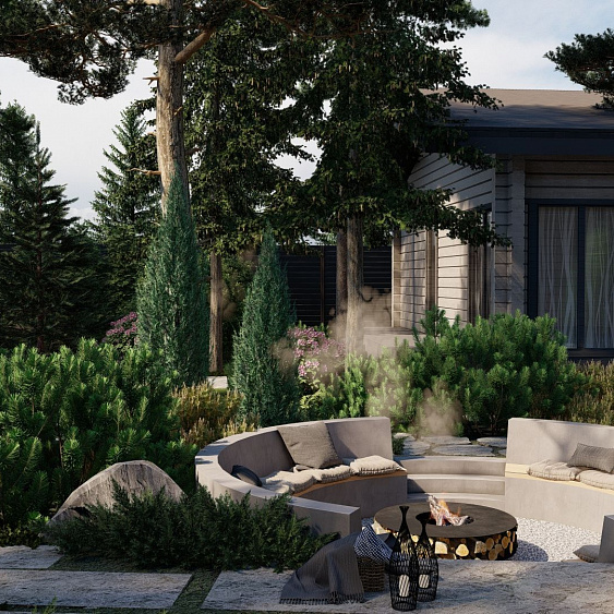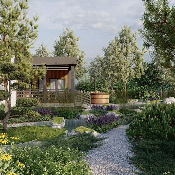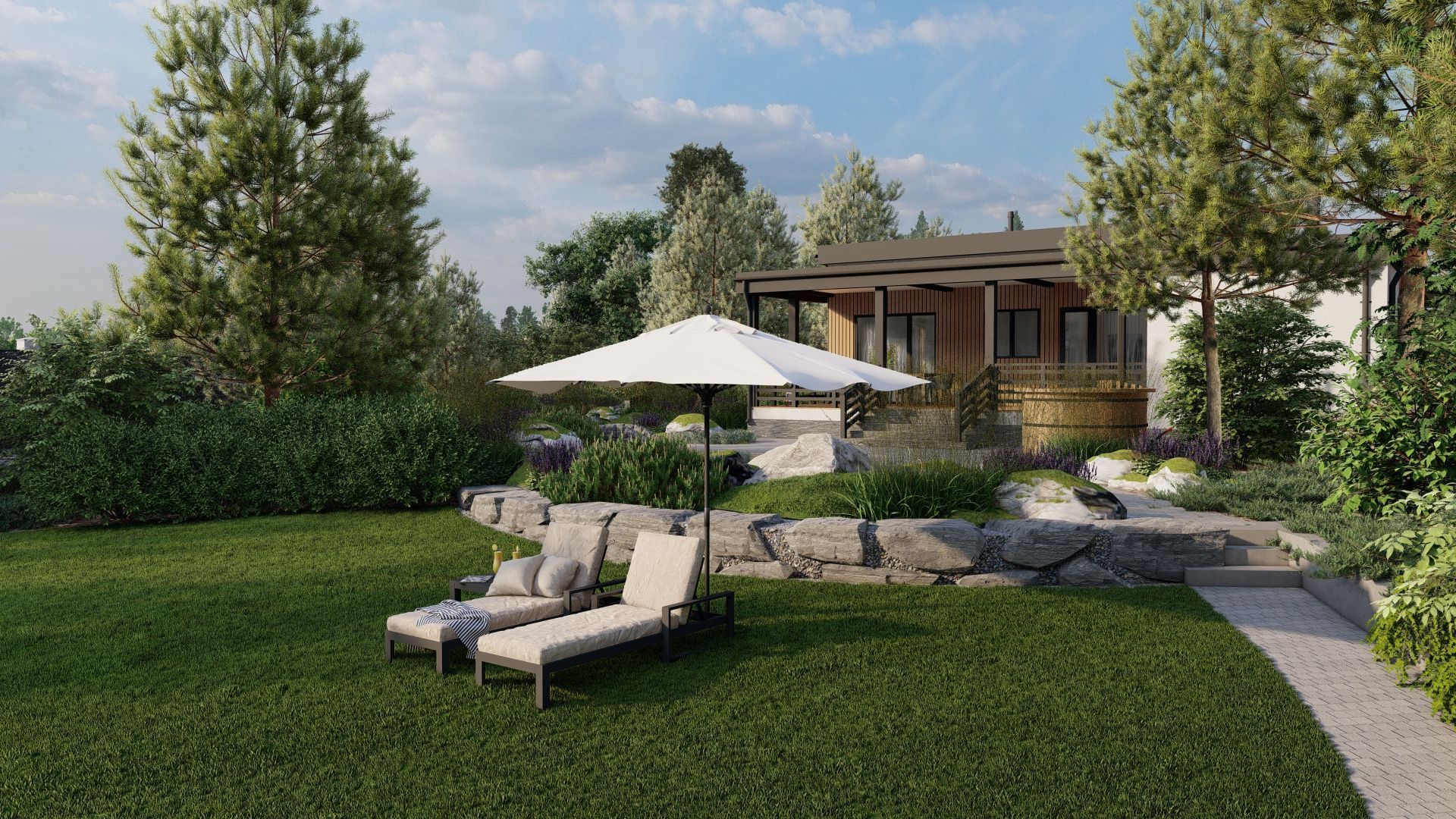 Ландшафтный проект участка общей площадью 18 соток: генплан, эскиз, фоторендеры, топографическая съемка, дендроплан, план освещения, спецификации, ведомости.