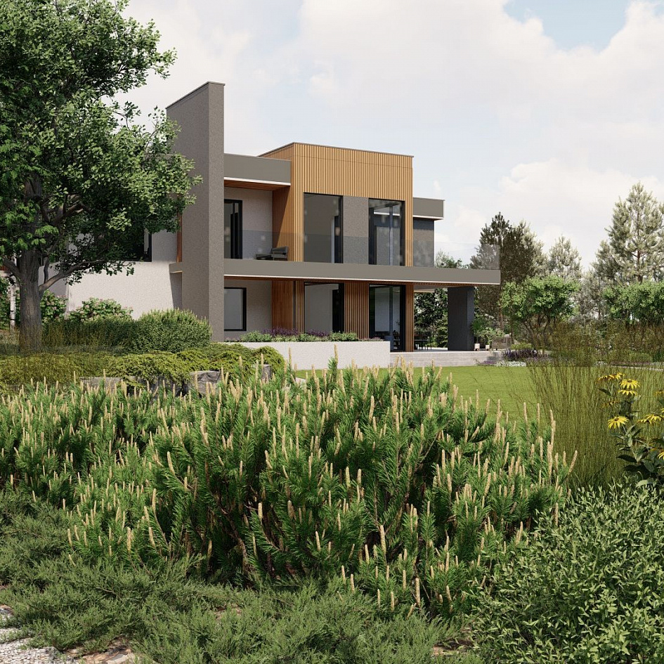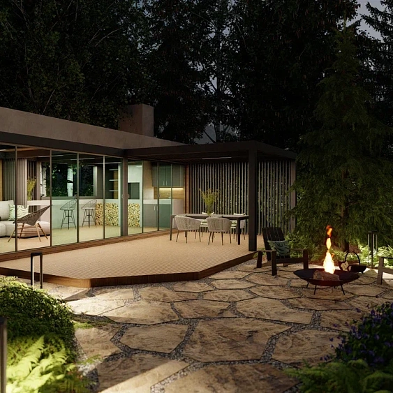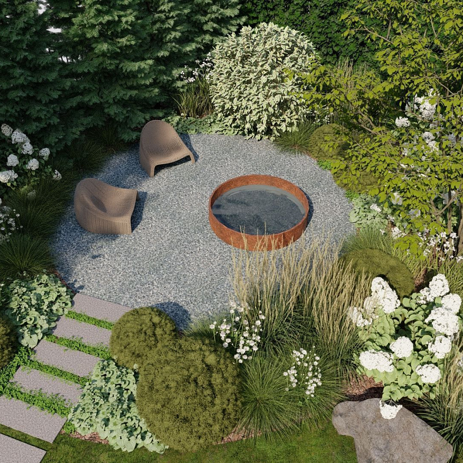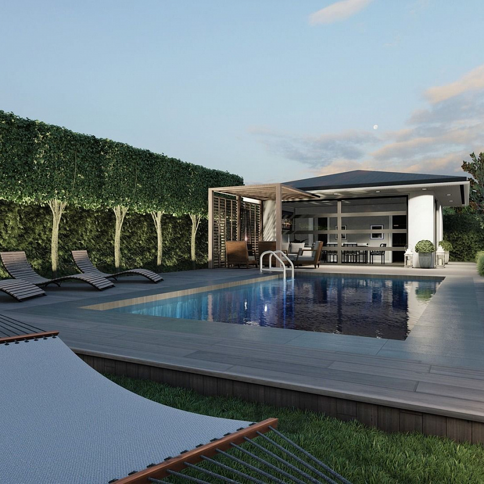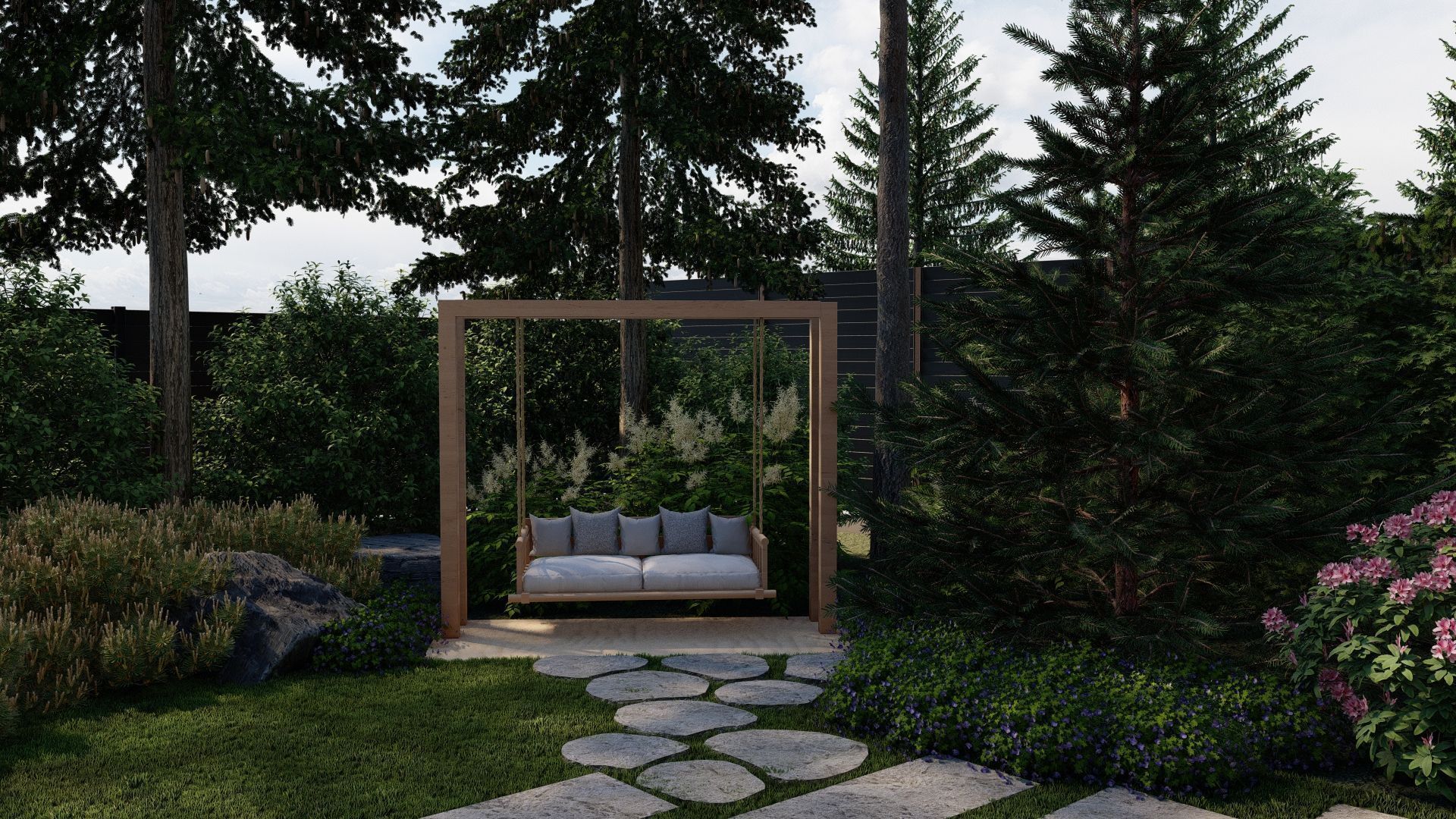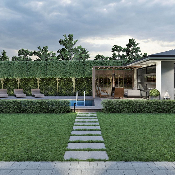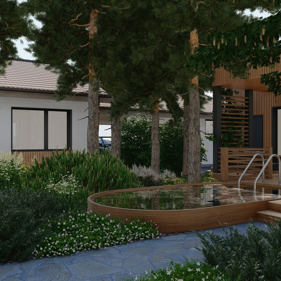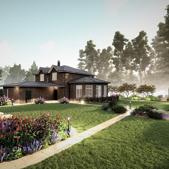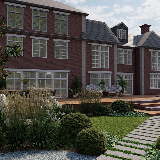 Ландшафтный проект участка общей площадью 18 соток: генплан, эскиз, фоторендеры, топографическая съемка, дендроплан, план освещения, спецификации, ведомости.