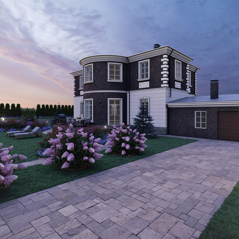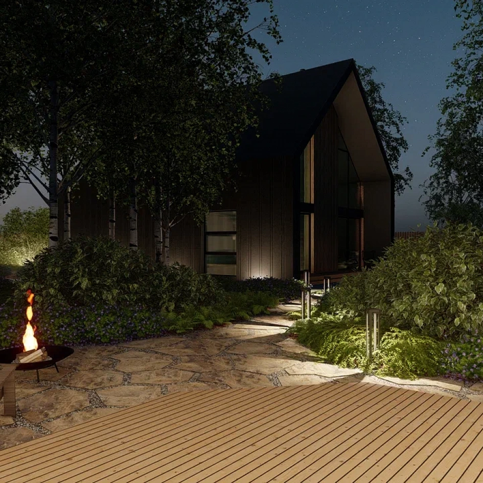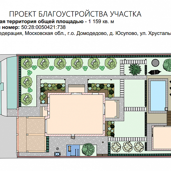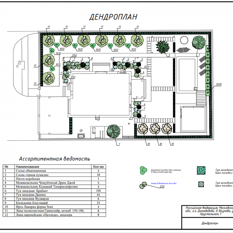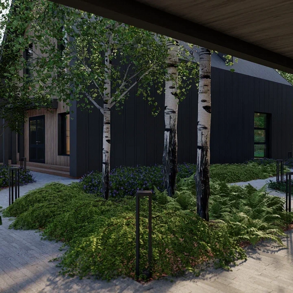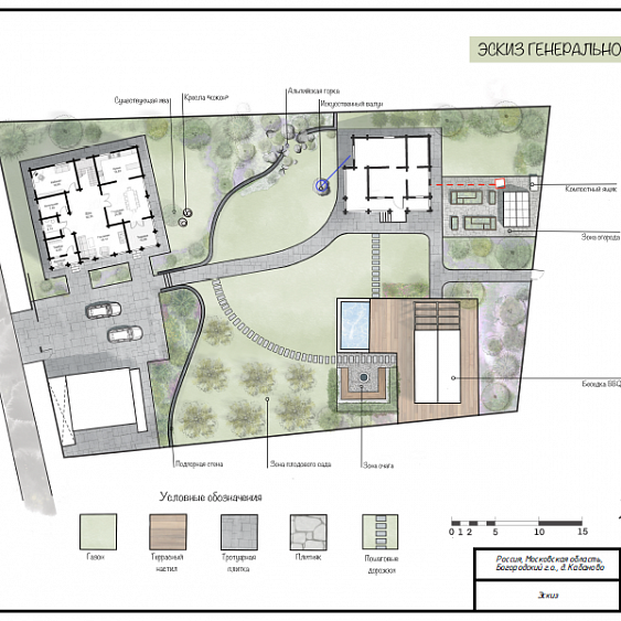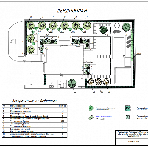 Ландшафтный проект участка общей площадью 12 соток в деревне Юсупово г.о. Домодедово: генплан, эскиз, фоторендеры, топографическая съемка, дендроплан, план освещения, спецификации, ведомости.