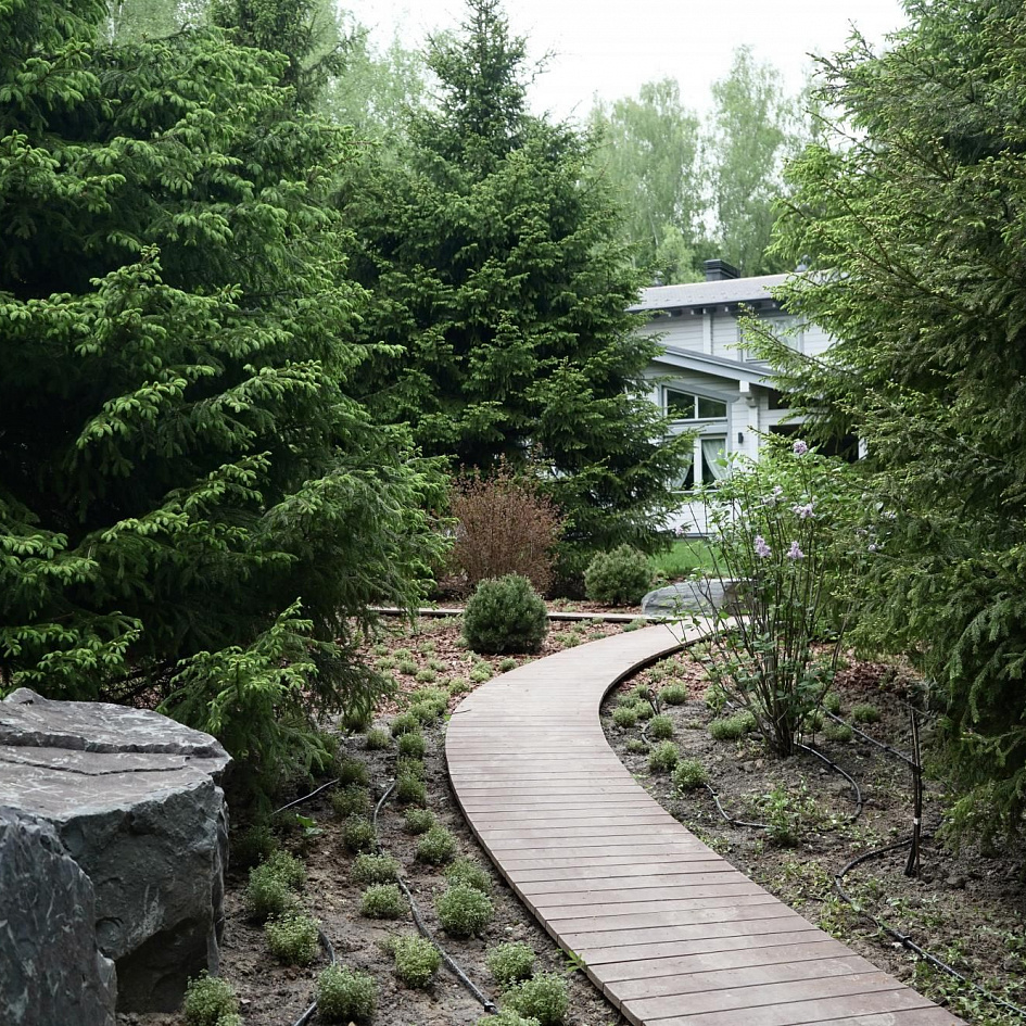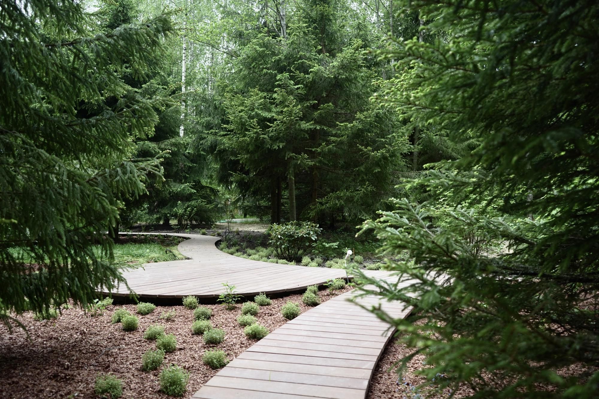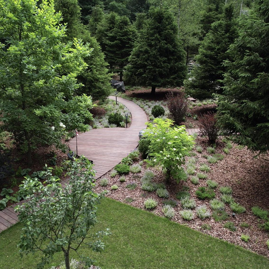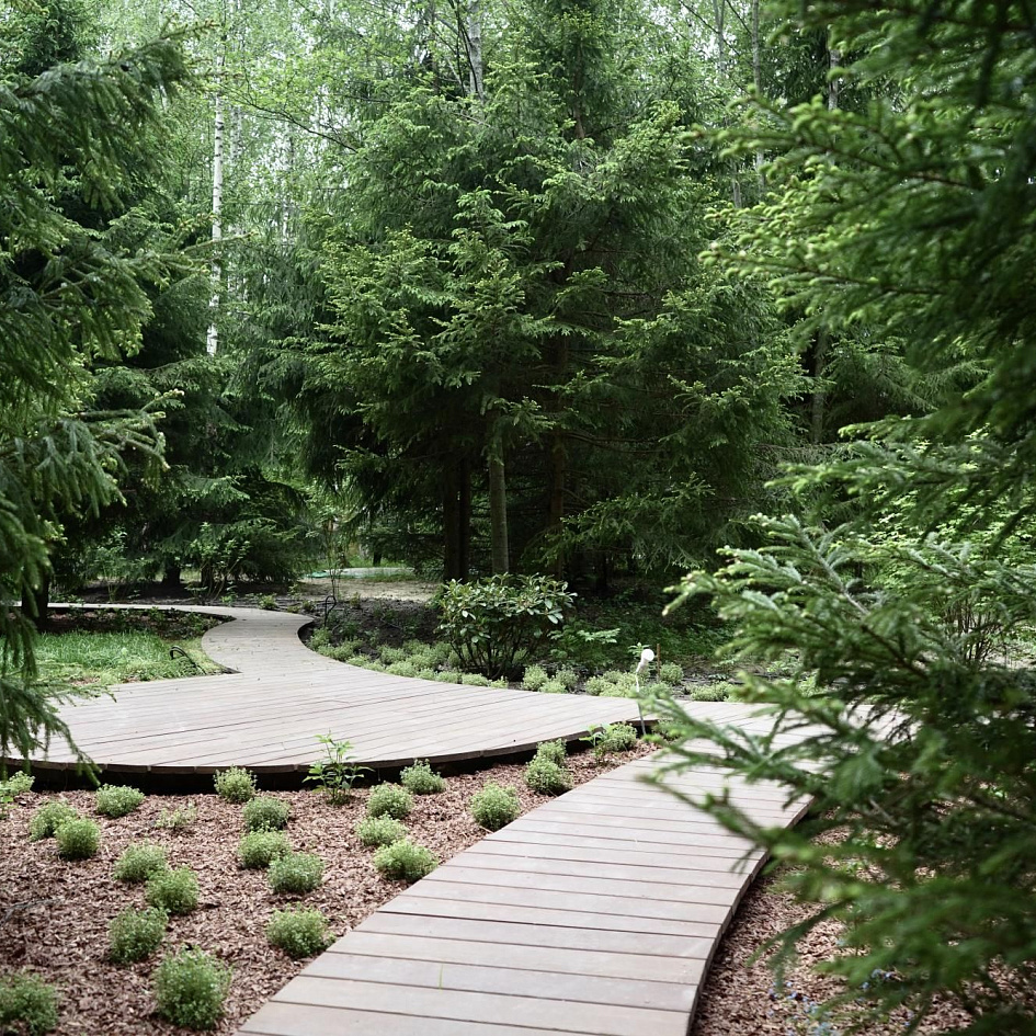 Полная реализация ландшафтного проекта на лесном участке со строительством пруда, круглогодичной теплицы и парящих дорожек из лиственницы.