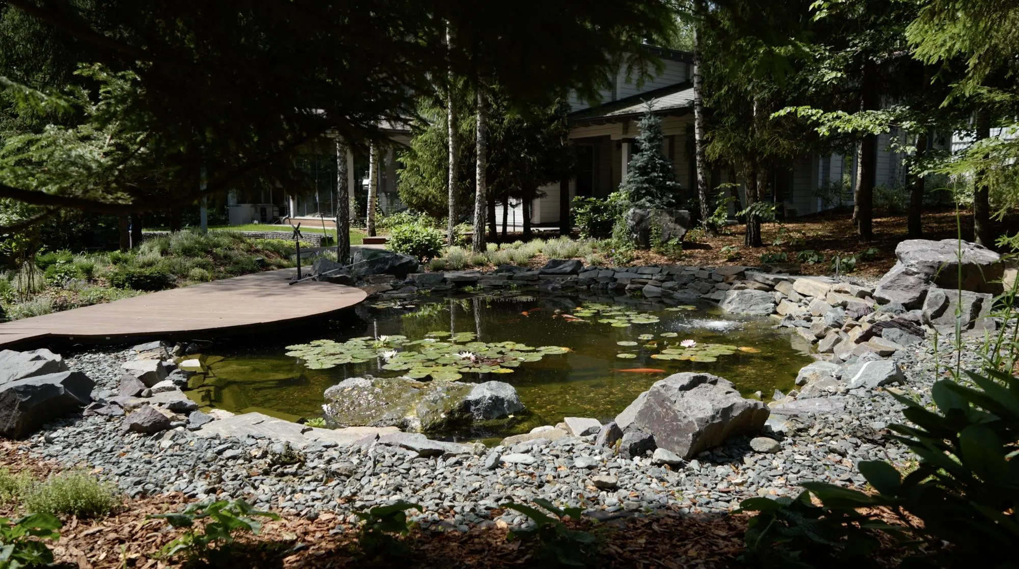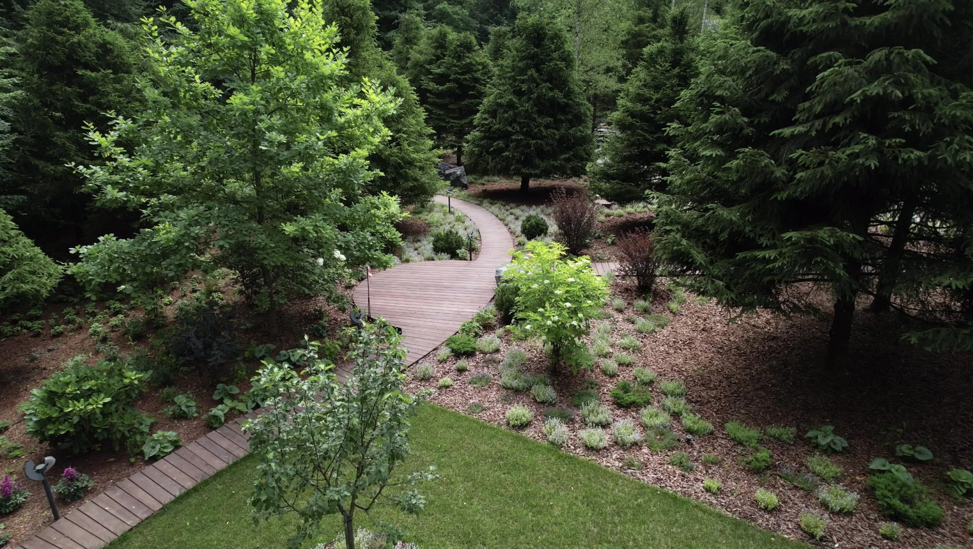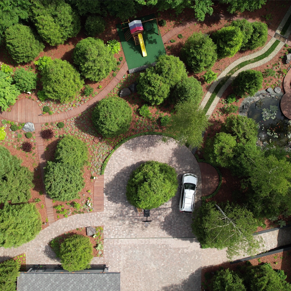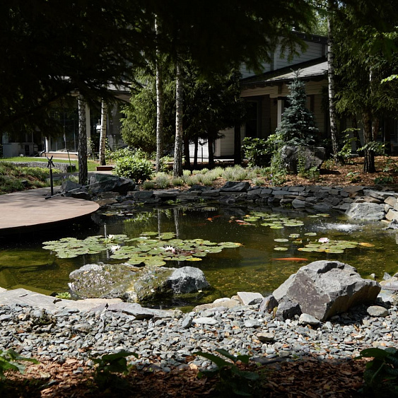 Полная реализация ландшафтного проекта на лесном участке со строительством пруда, круглогодичной теплицы и парящих дорожек из лиственницы.
