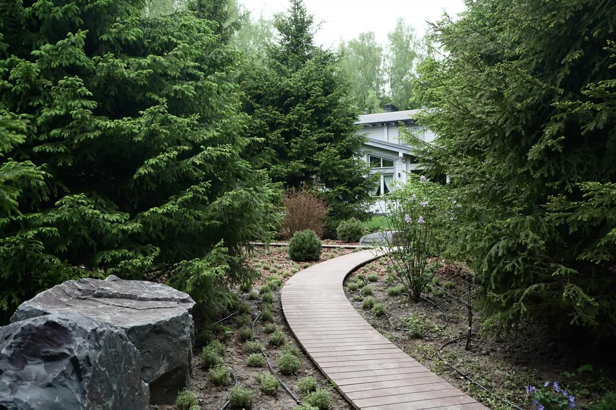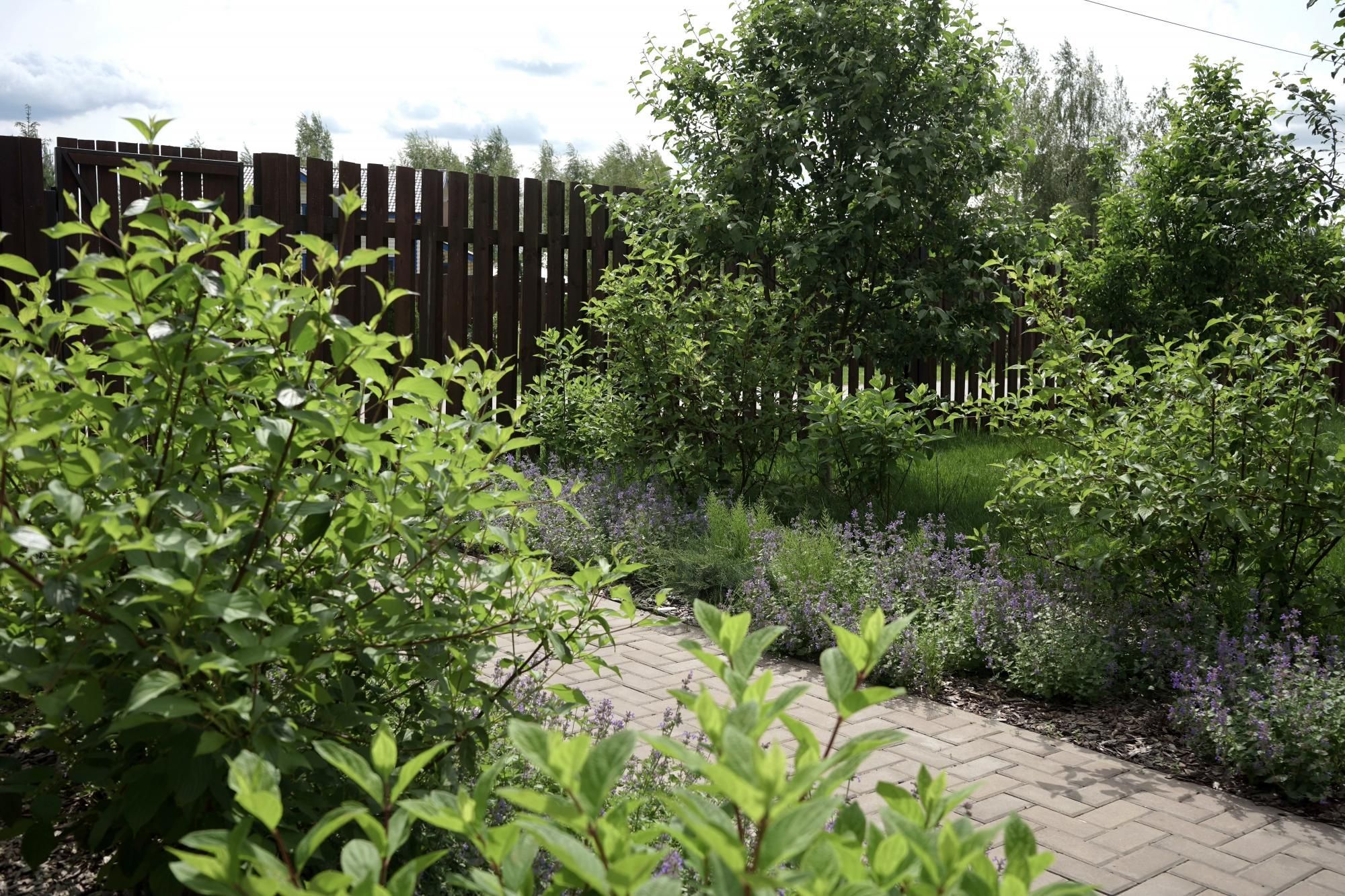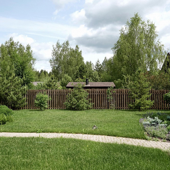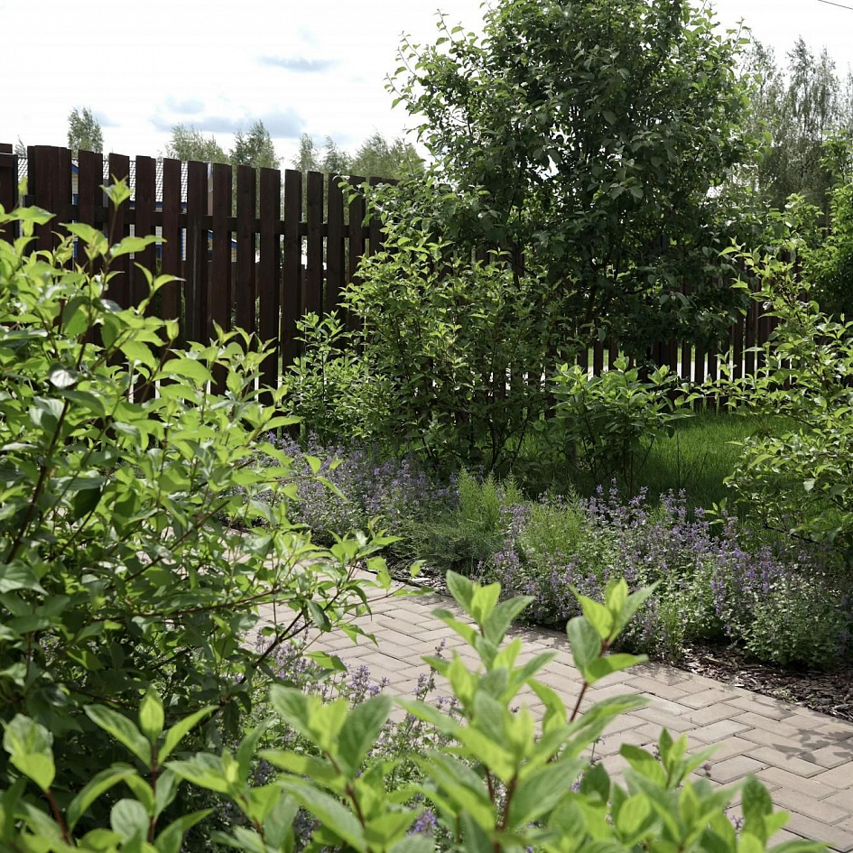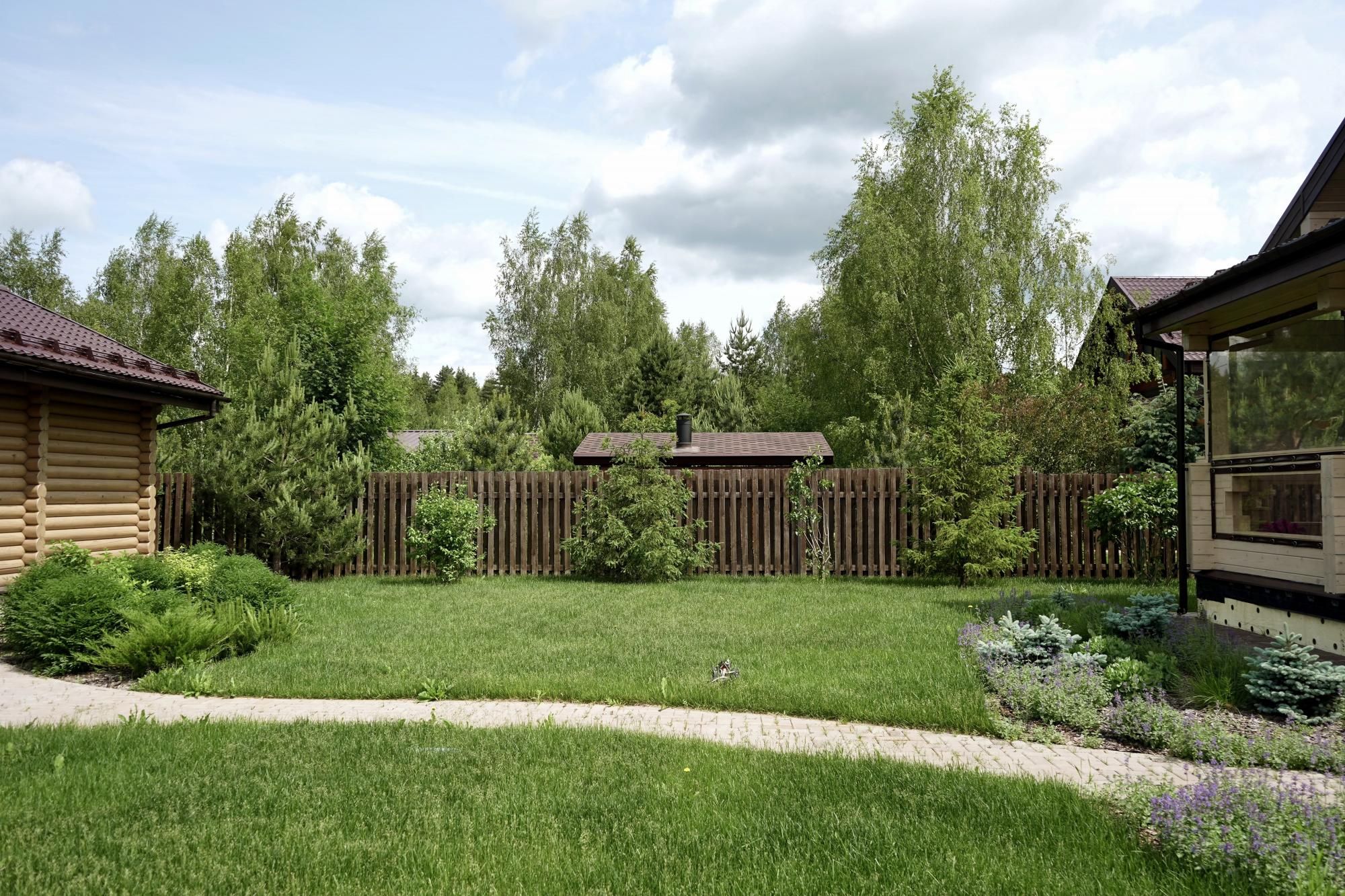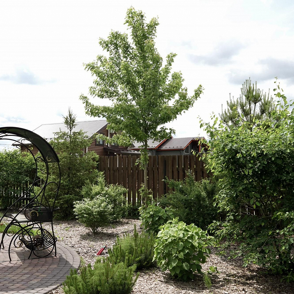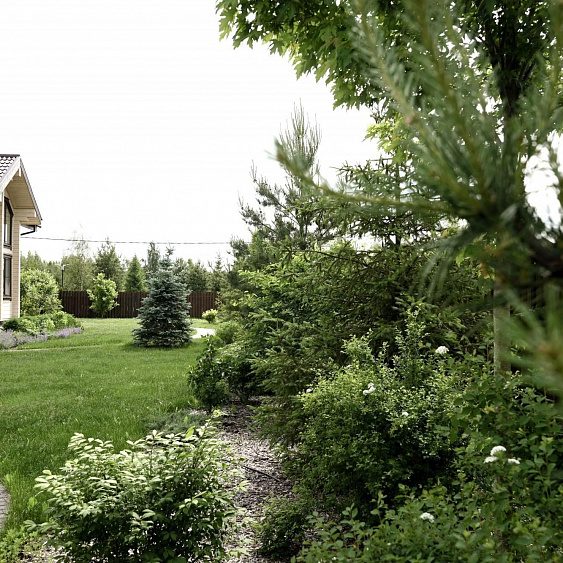 Требовалось комплексно оформить участок в природном стиле под дом из бруса, сохранив существующие растения.