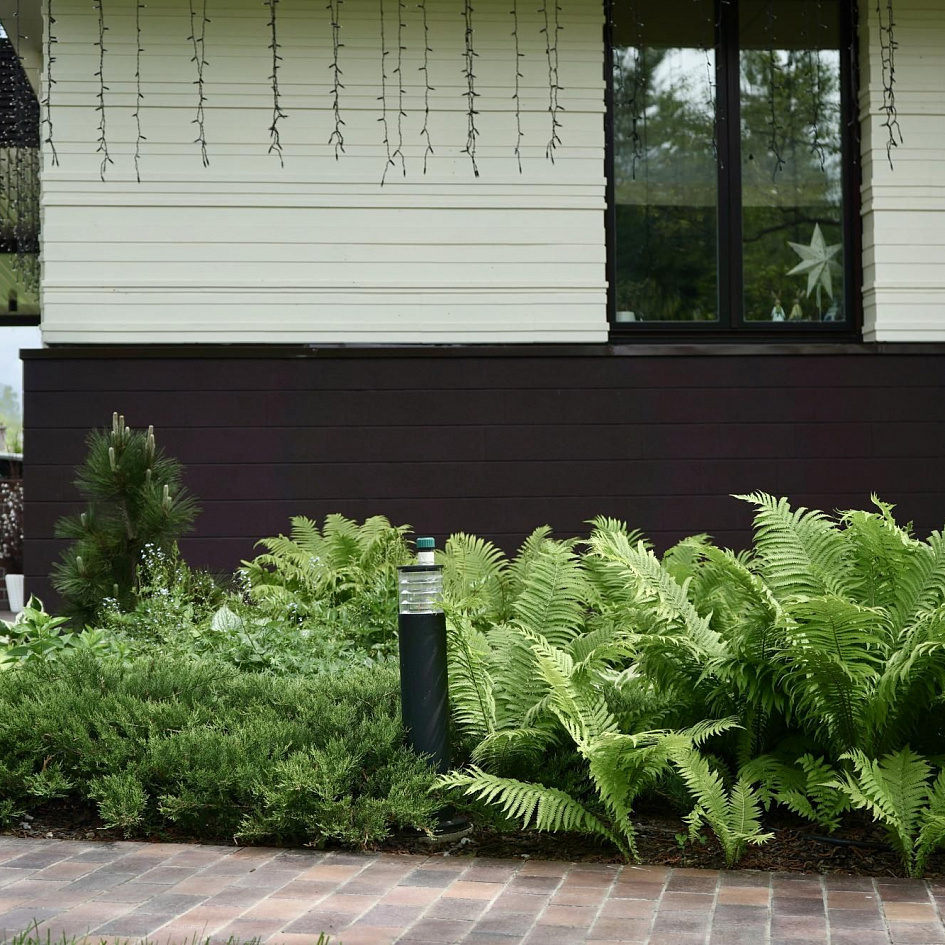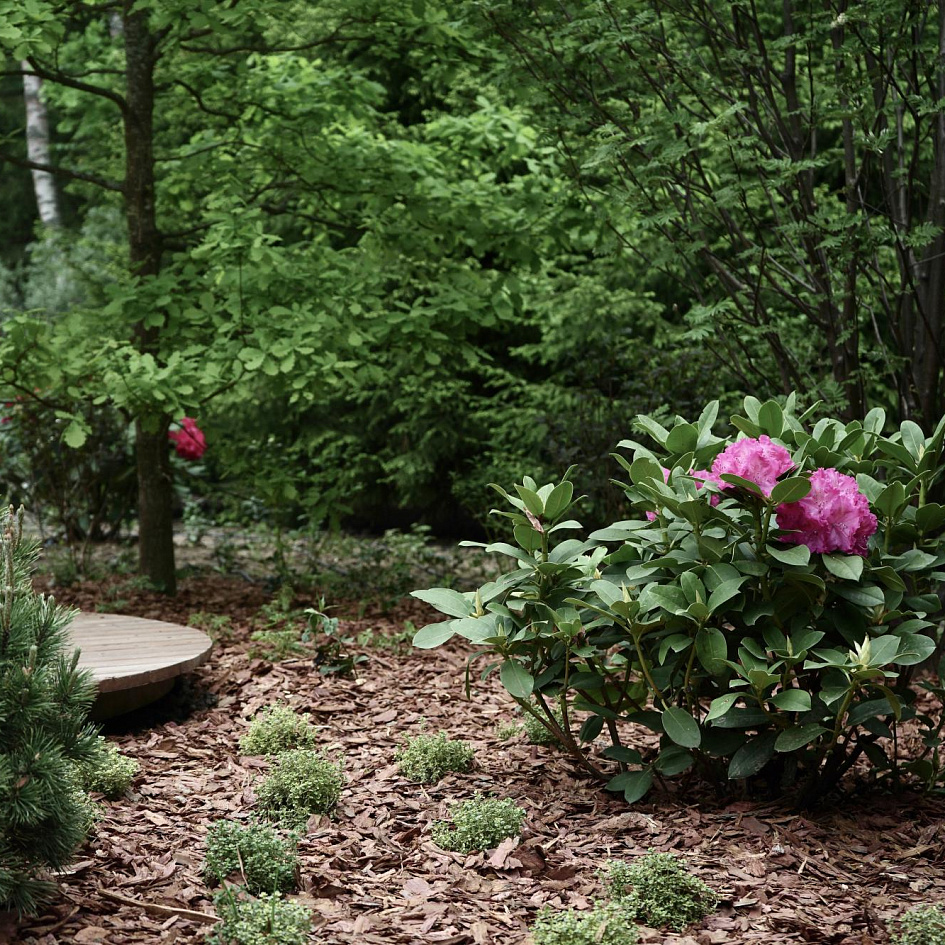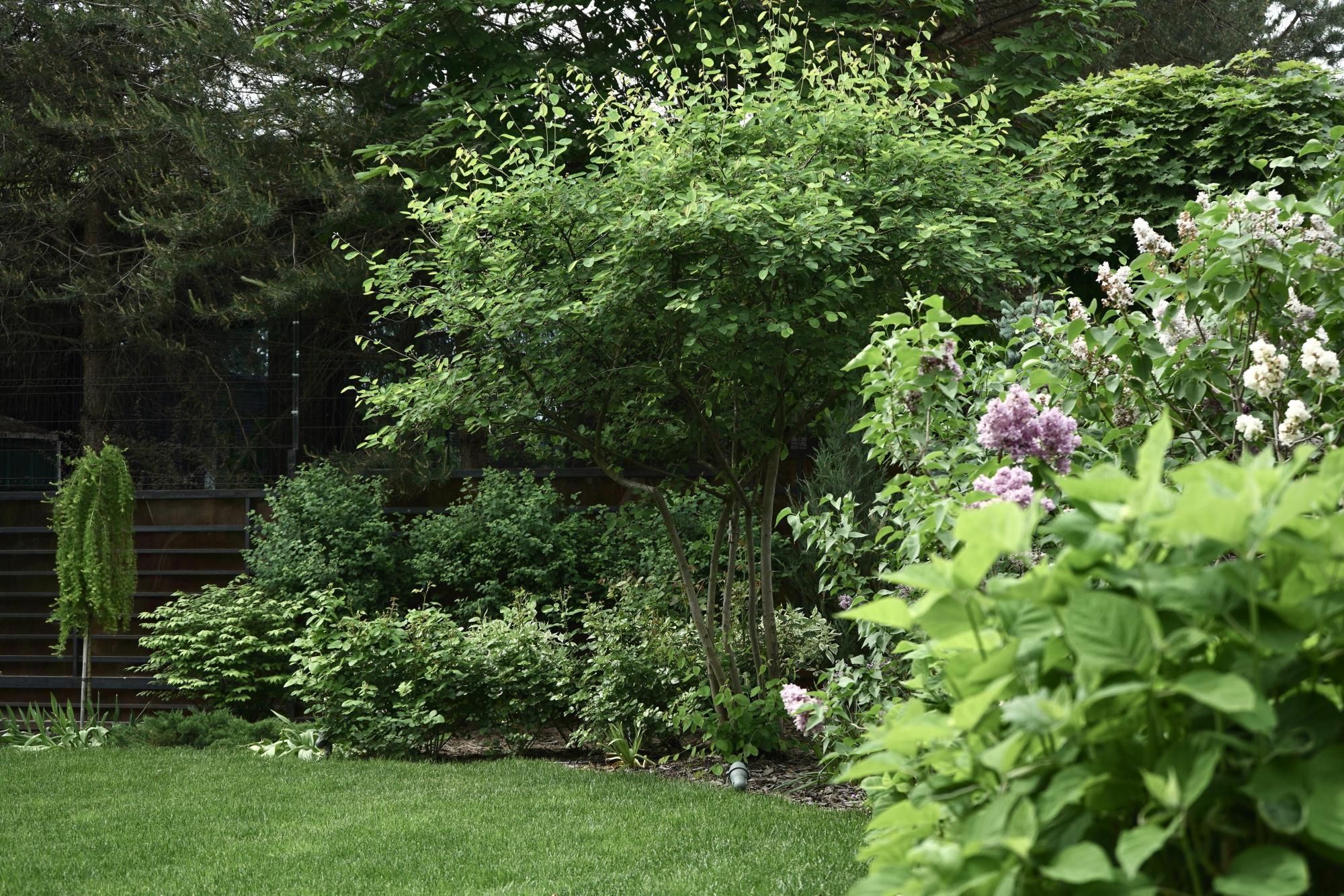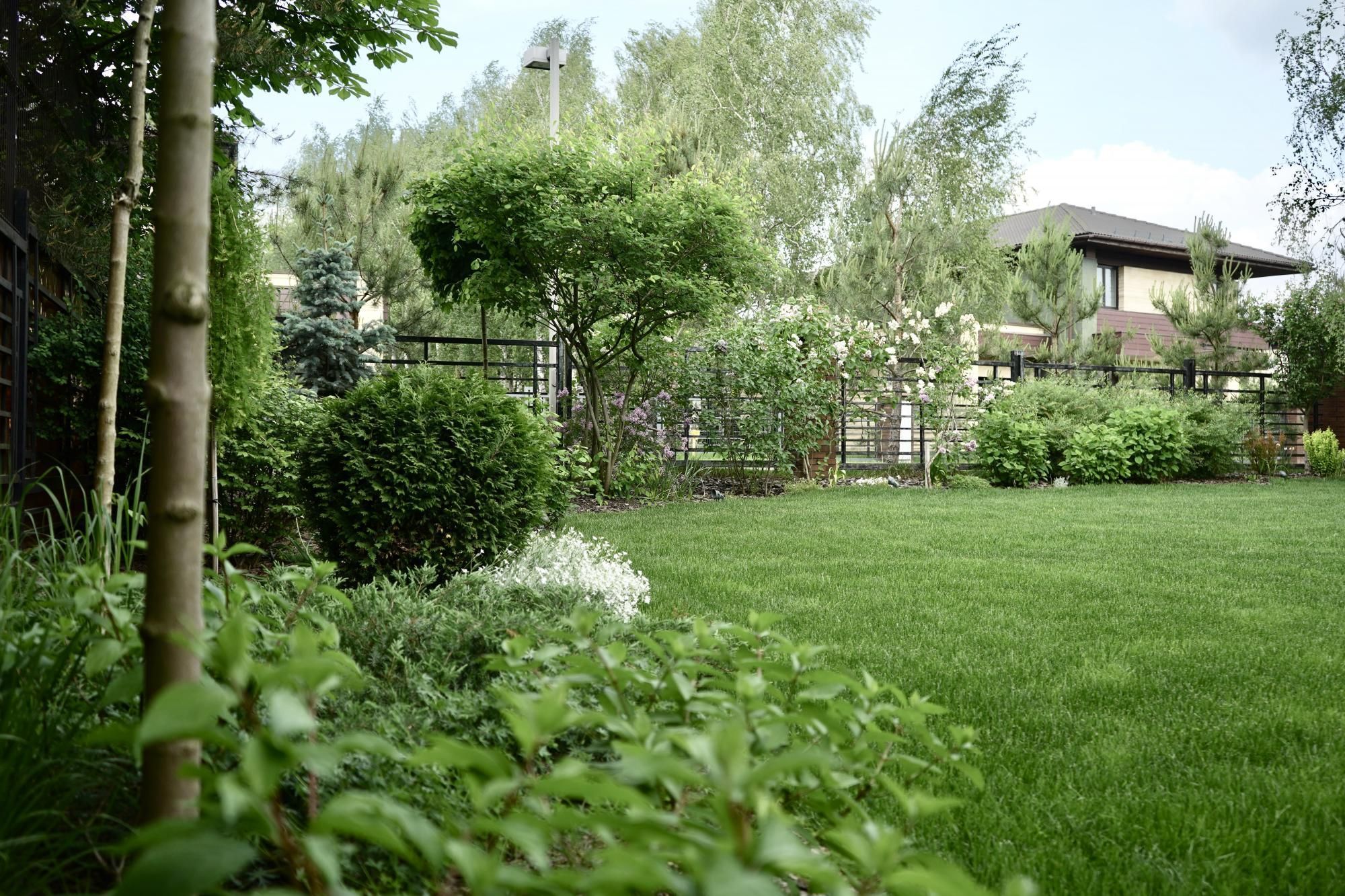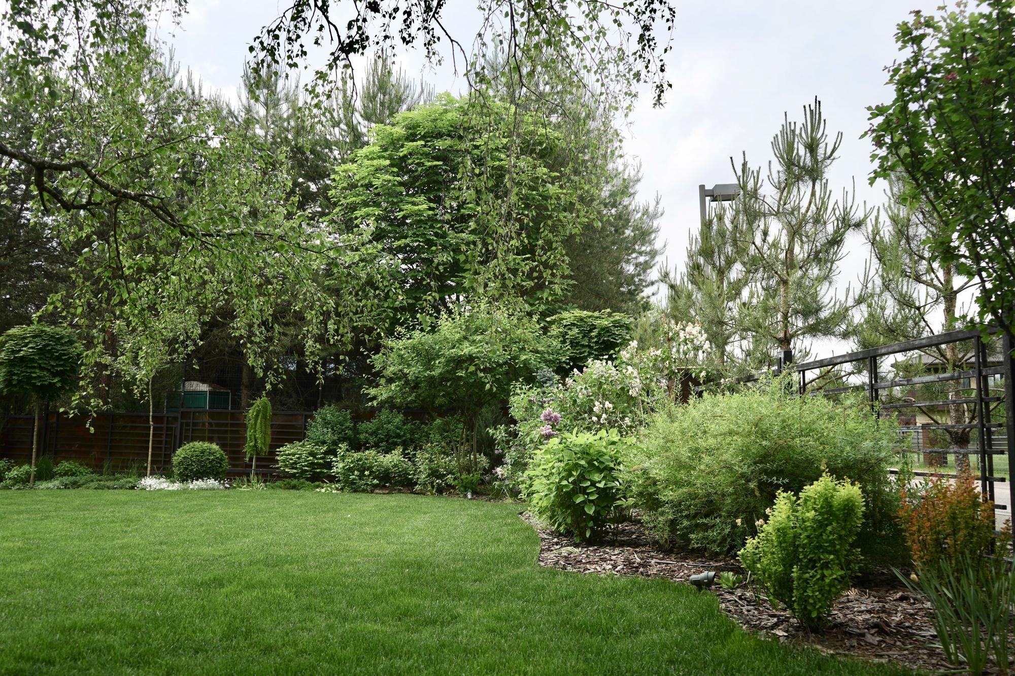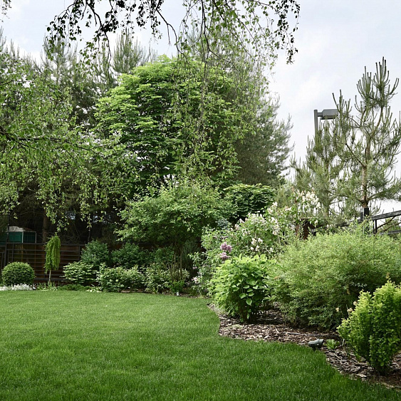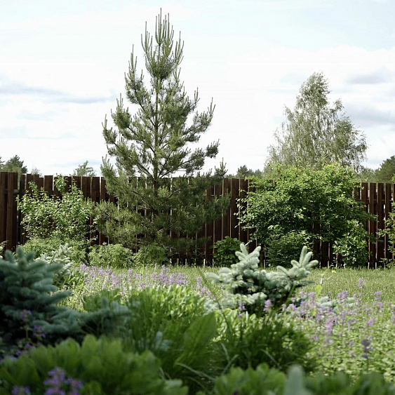 Требовалось комплексно оформить участок в природном стиле под дом из бруса, сохранив существующие растения.