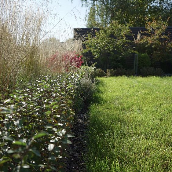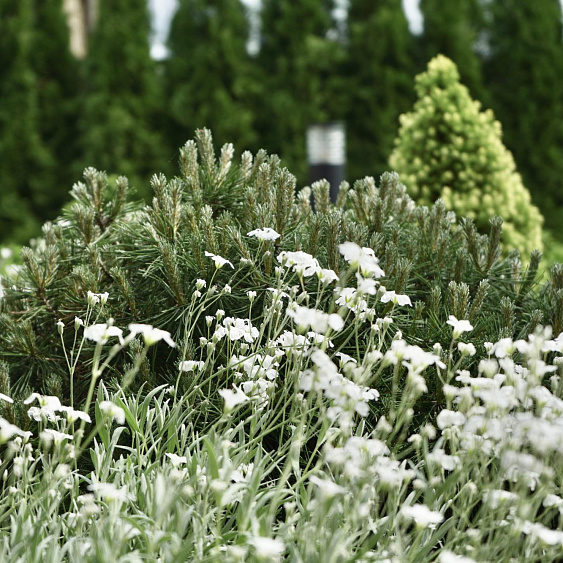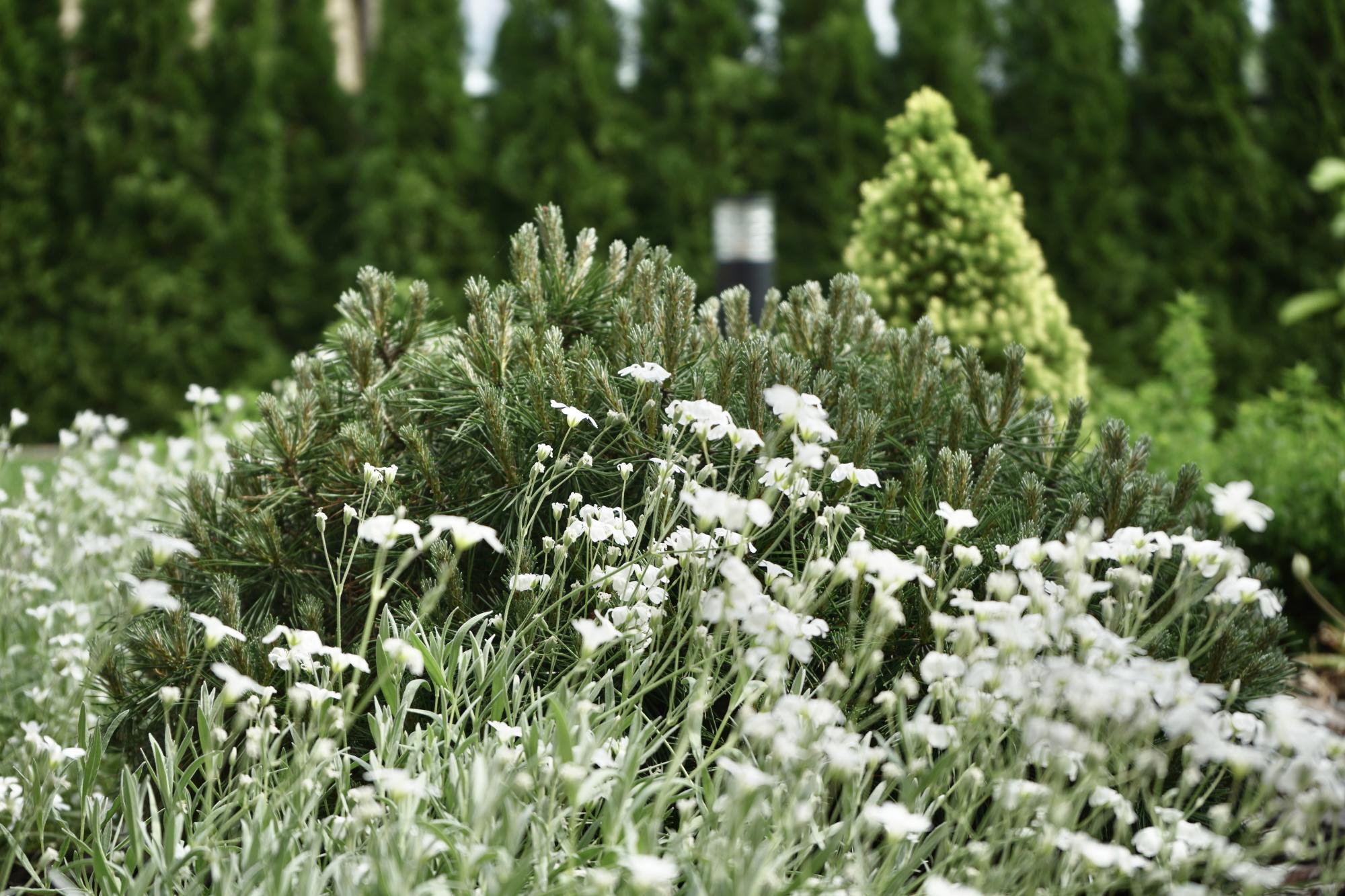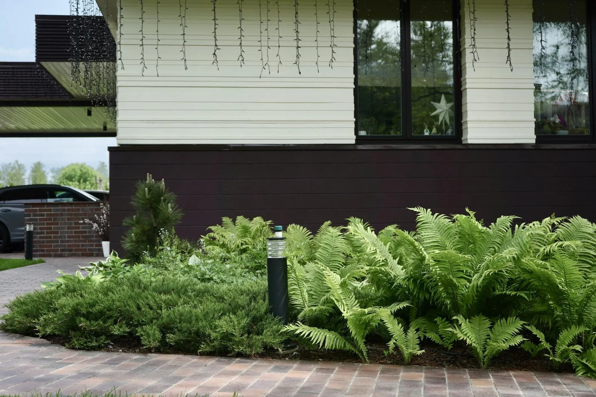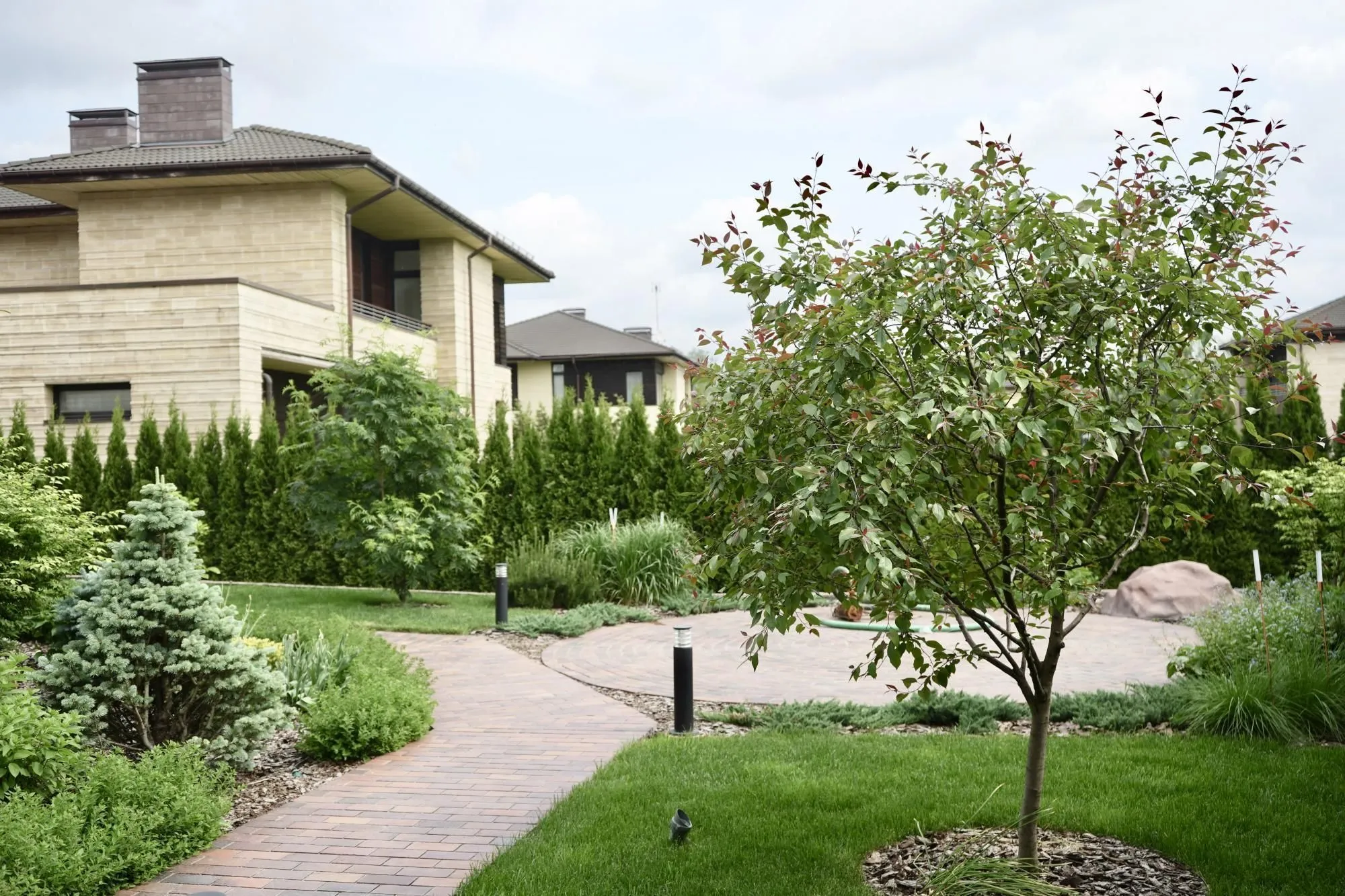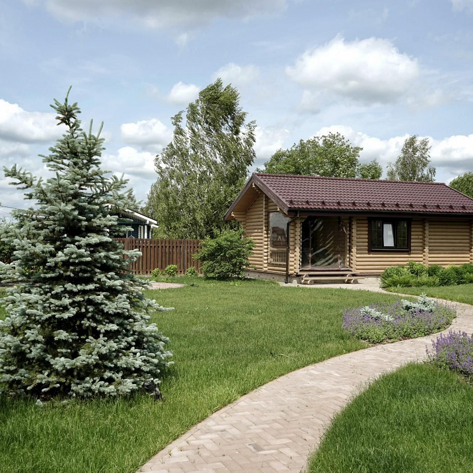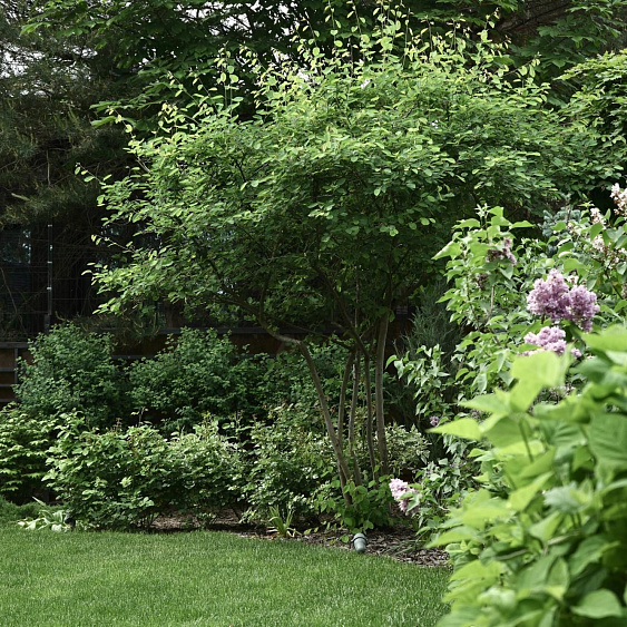 Требовалось комплексно оформить участок в природном стиле под дом из бруса, сохранив существующие растения.
